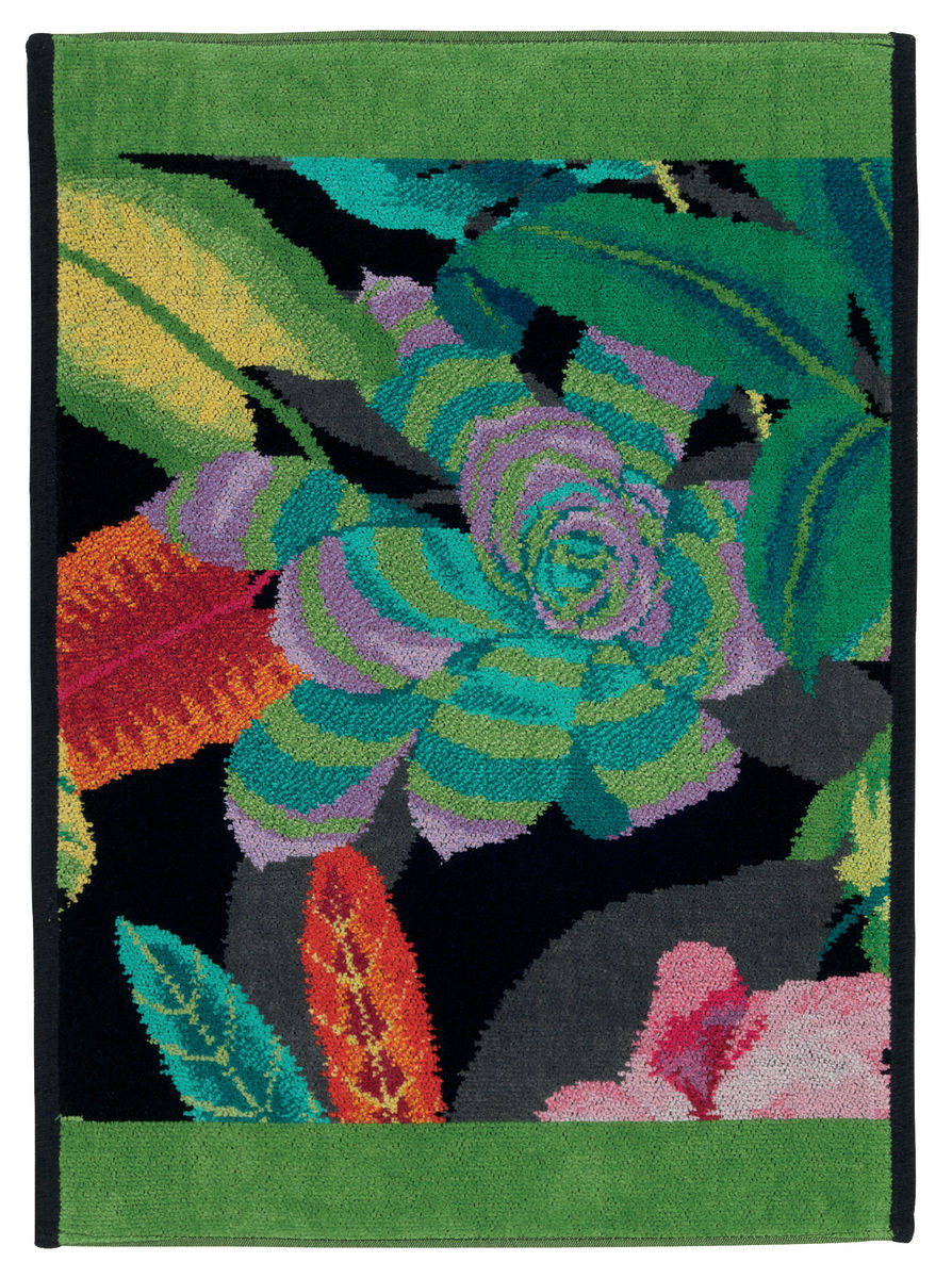 FEILER, extravagantes kleines Gästetuch aus der Serie RAINFOREST mit exotischen Blüten & Blätter in multcolor mit grünem Rand auf schwarzem Grund. Das Tuch ist bei 60 ° waschbar und hat eine Größe von 37 x 50 cm. Made in Germany!