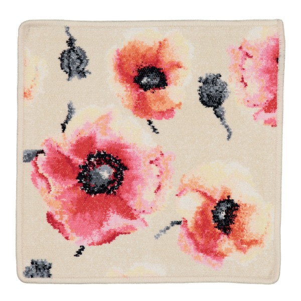 Das elfenbeinfarbene Seiftuch mit cremefarbenem Rand, roten Mohnblüten und anthrazitfarbenen Mohnkapseln hat eine Größe von 30 x 30 cm und ist bei 60 ° C waschbar.