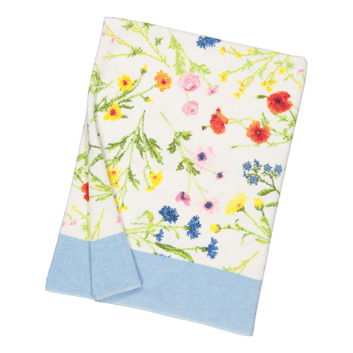 Eine blühende bunte Sommerwiese zeigt die Handtuchserie FLOWER MEADOW aus weichem Chenille und FLOWER MEADOW BORDER aus Frottier mit Chenillebordüre von FEILER. Jede Blüte ist ein kleines Wunder der Natu