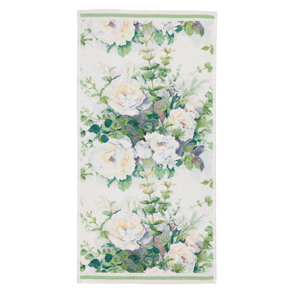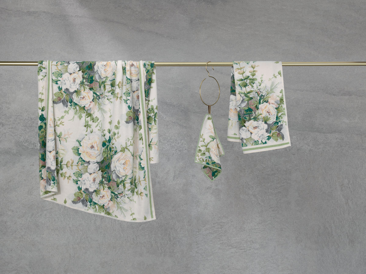 Ein modernes harmonisches Dessin von FEILER ist JULIETTE. Ein floraler Traum mit hellen Rosenblüten von Kräuer umgarnt in grün auf eierschalfarbenem Grund ist das Muster auf Seif - Gäste - Hand - Dusch - und Badetuch. Als Ergänzung ist ein Turban, kissenhülle und eine Wohndecke/Plaid erhältlich.