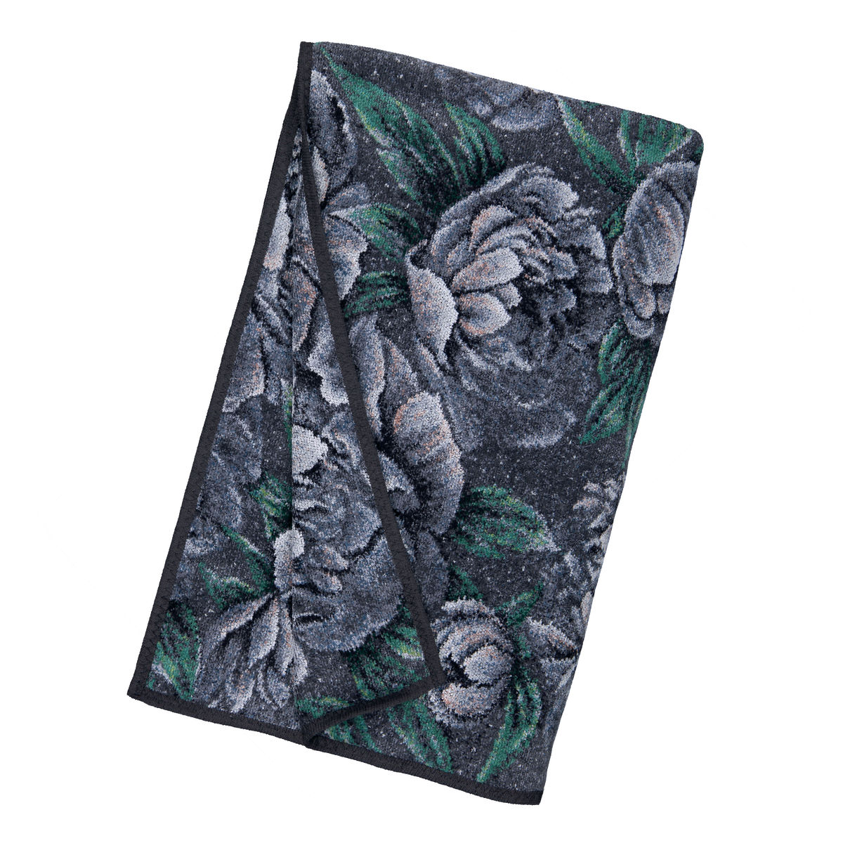 Ein besonderes Dessin von FEILER ist DARK PEONY. Mystische Harmonie: Üppige Pfingstrosen tanzen auf dunkler See. Grün mit graphit-grau ist das Muster auf Seif - Gäste - Hand - Dusch - und Badetuch. Als Ergänzung ist eine Kissenhülle und eine Wohndecke/Plaid erhältlich.
