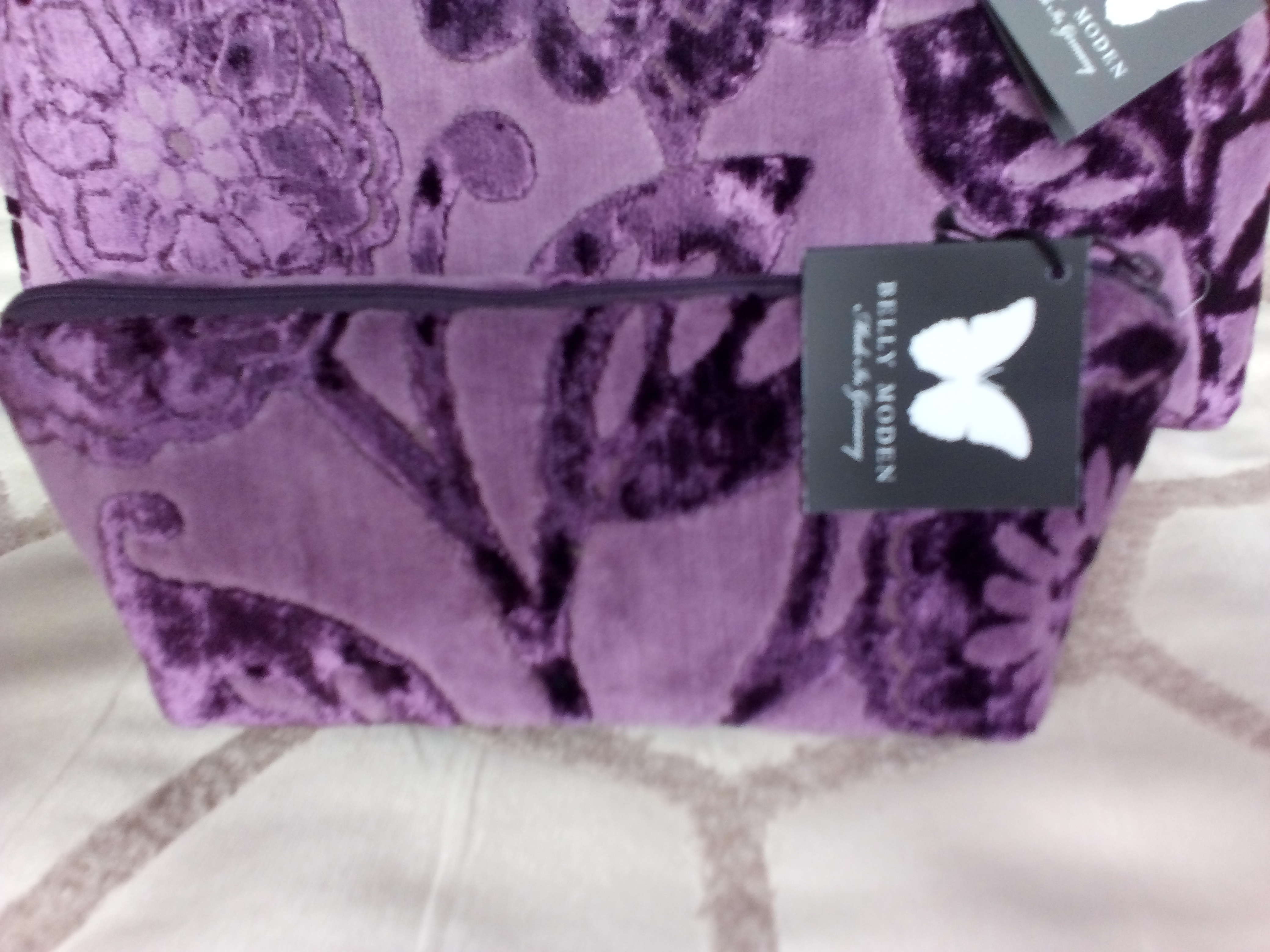 Für eine anspruchsvolle Dame ist die längliche Schminktasche LADY aus Samt in gedecktem lila mit floralem Dessin. Sie hat eine Größe von 16 x 6 x 8 cm und ein graues auswischbares Innenfutter. Ideal für Pinsel, Kamm und Mascara. Wie für eine Reise mit dem Orient Express gemacht.