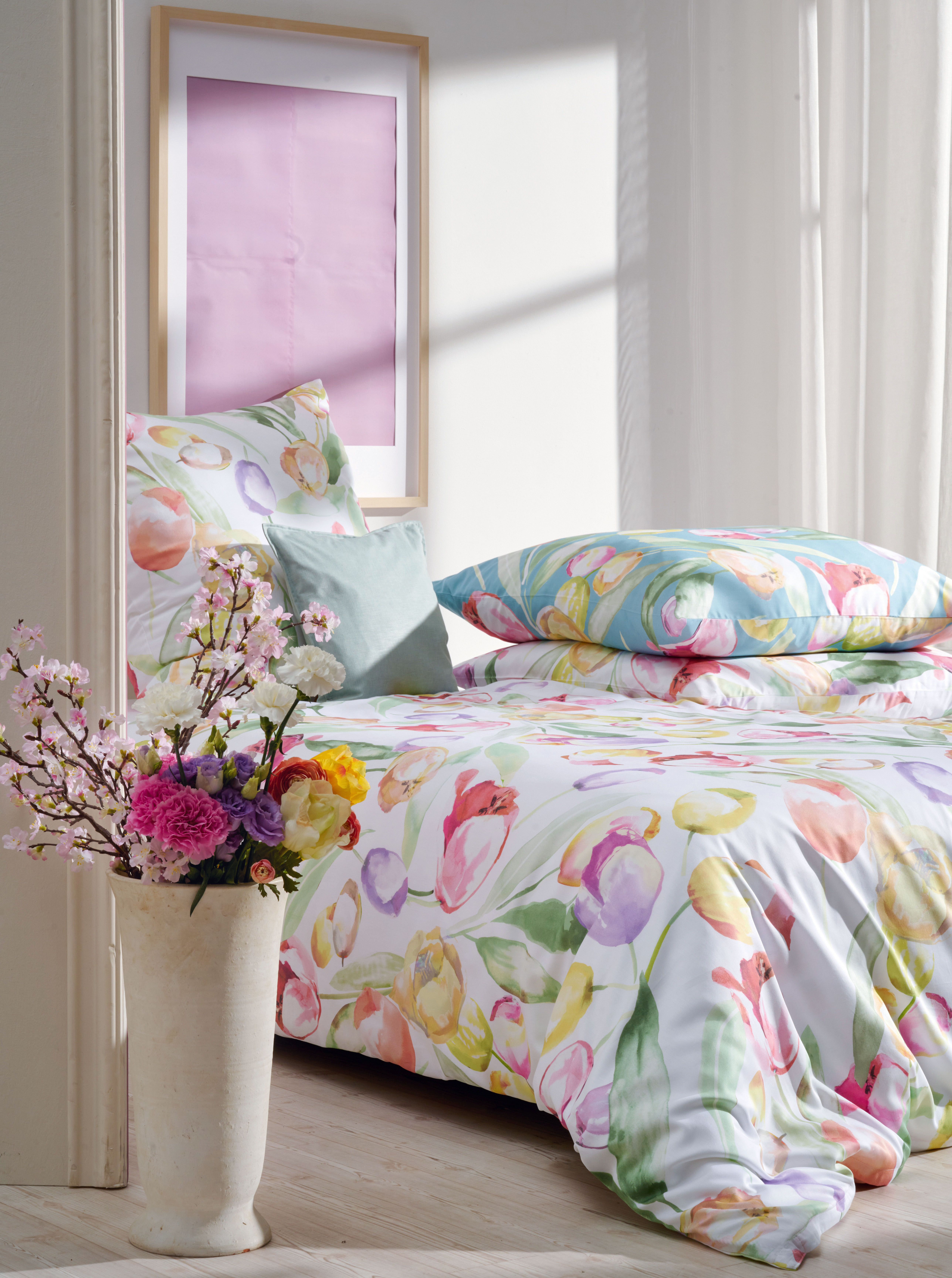 Aus der Bettwäsche-Kollektion von APELT ist das Frühlingsdessin TULIP. Die Garnitur ist In 135x200 und 155x220 erhältlich. Der Digitaldruck ist aus 100% mercesierter Baumwolle, umweltschonend hergestellt - nach GOTS & Ökotex Standart 100. Die Bettwäsche wird hochwertig verarbeitet, ist atmungsaktiv, weich und anschmiegsam mit seidigem Griff. In türkis und in eierschalfarben erhältlich. Außerdem ein Kimono.