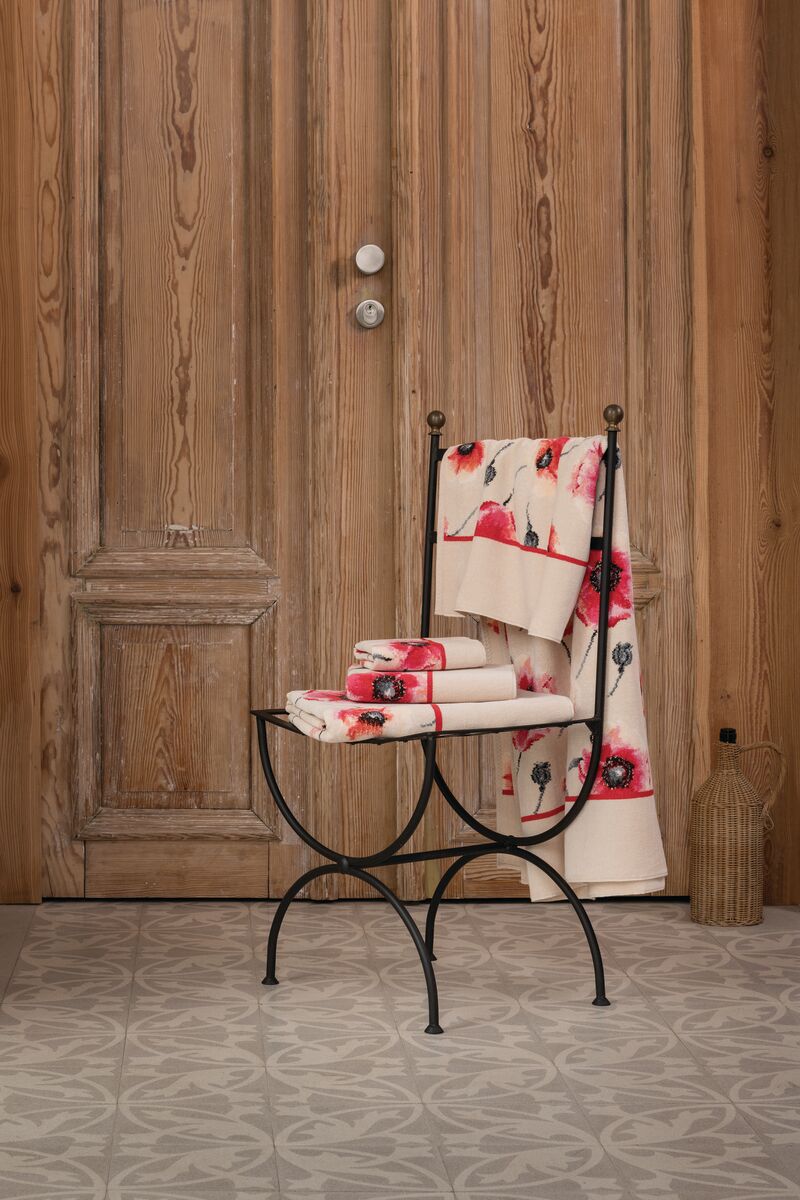 Das elfenbeinfarbene Handtuch mit roten Mohnblüten und anthrazitfarbenen Mohnkapseln hat eine Größe von 50 x 100 cm und ist bei 60 ° C waschbar.