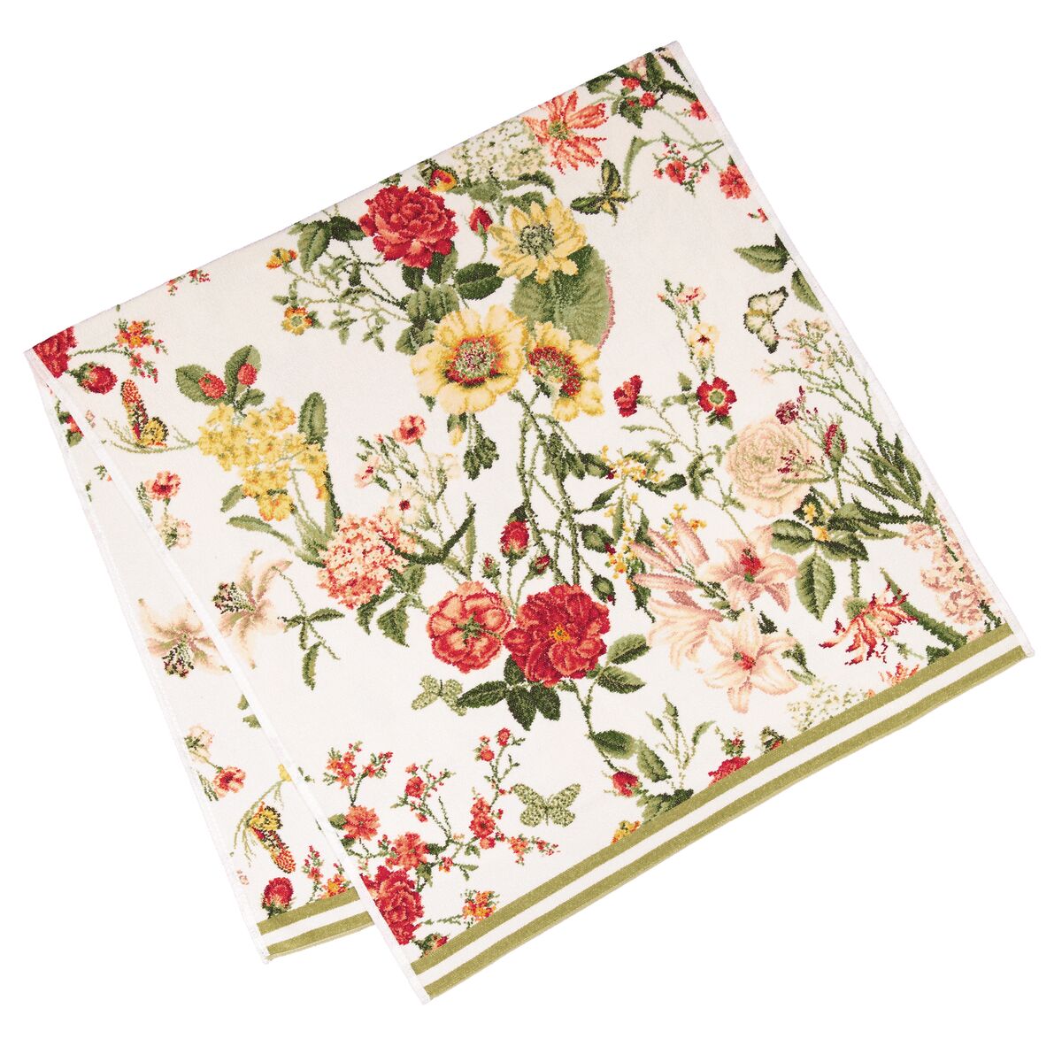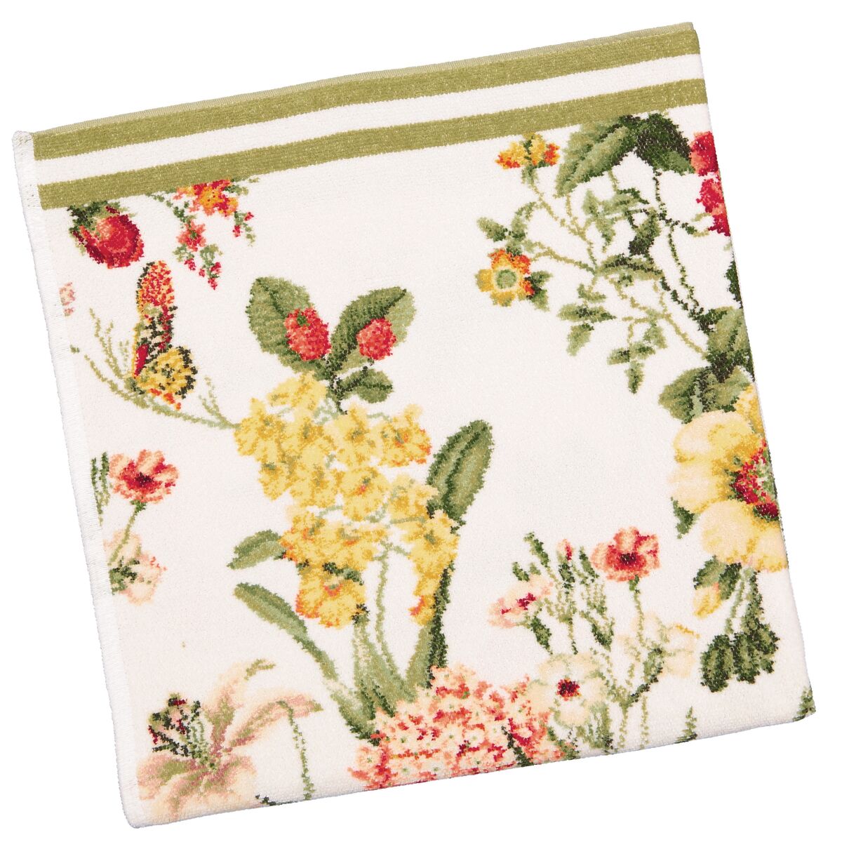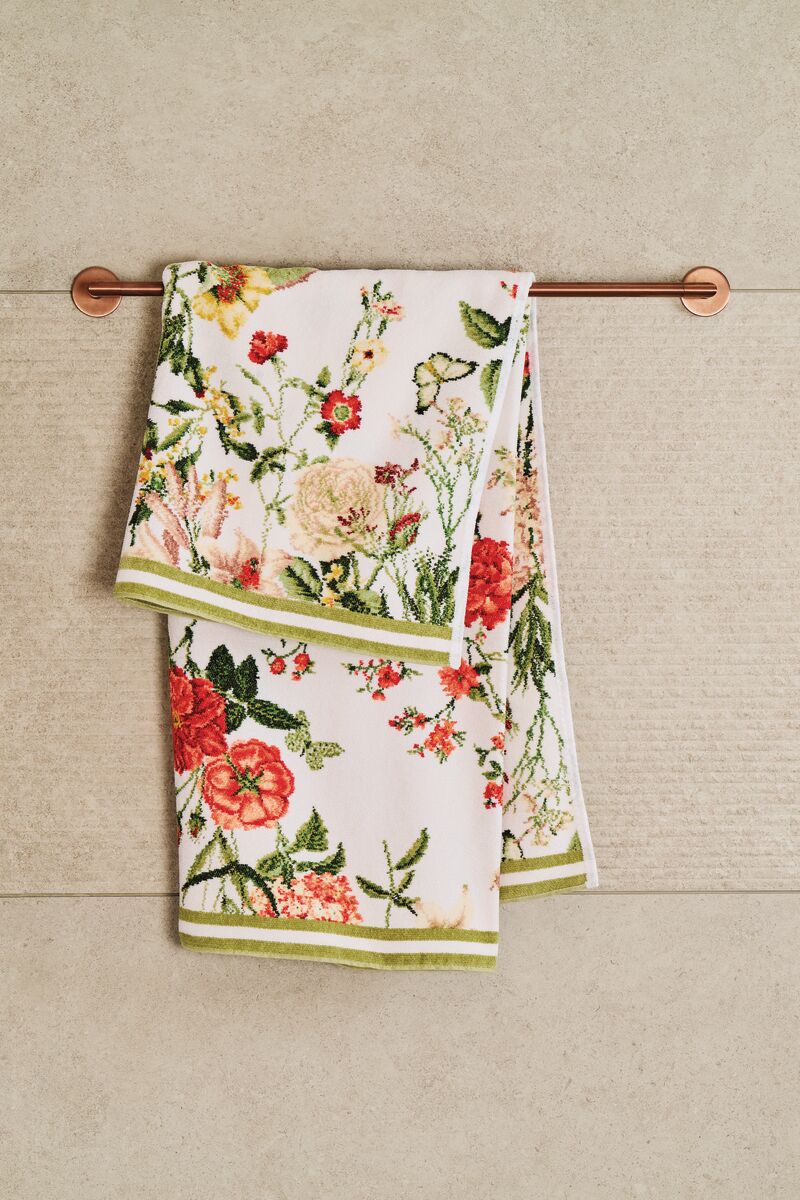 Die neue Handtuchserie LUZIE ist eine frische moderne Blütenkomposition aus gelber Schlüsselblume, hellroten Rosen, lachsrosa Lilien und mehrfarbigen Schmetterlingen. Unterschiedlich grüne Blätter runden das Dessin geschmackvoll ab. Diese Serie ist in zwei unterschiedlichen Farbstellungen erhältlich: 108 ist der frische messinggelbe Rand und 180 der klassische schilfgrüne Rand. Es sind Seiftuch, Gäste - Hand - Dusch - und Badetuch sind erhältlich.