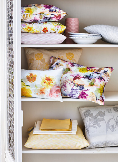 APELT, gefülltes Kissen mit großen Osterglocken, Narzissen und Tulpen in den Farben himbeer, gelb, orange und flieder auf eierschalfarbenem Grund. Die Serie ist aus reiner Baumwolle. Das Kissen hat eine Größe von ca. 25 x 50 cm, ist bei 30° waschbar und nicht trocknergeeignet.