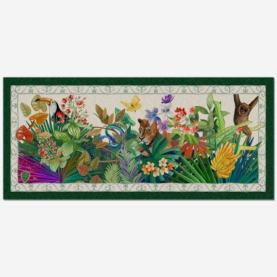 Die Matte NAIF hat mehrfarbige exotische Pflanzen und eine versteckte Raubkatze als Motiv. Sie hat eine Größe von 52 x 120 cm.