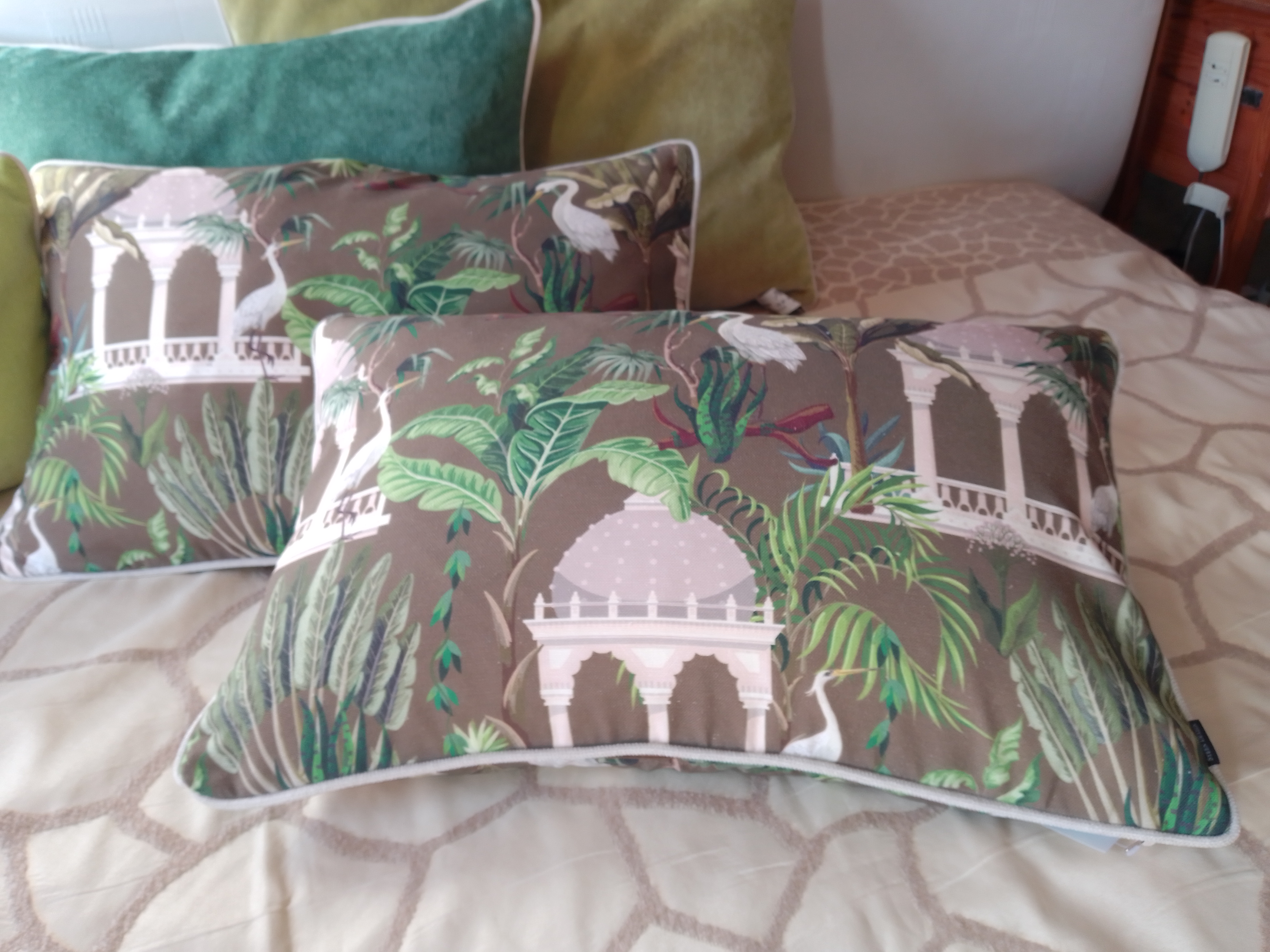 Die indisch anmutende Kissenhülle COLONNO mit cremefarbenem Samtkeder hat Pagoden, Kranich und Palmengewächse als Motiv. Die exotische Hülle mit Reissverschluß hat eine Größe von 40 x 60 cm und ist aus 50 % Polyester / 50 % Baumwolle, bei 30°C waschbar, aber nicht trocknergeeignet. MADE IN GERMANY!