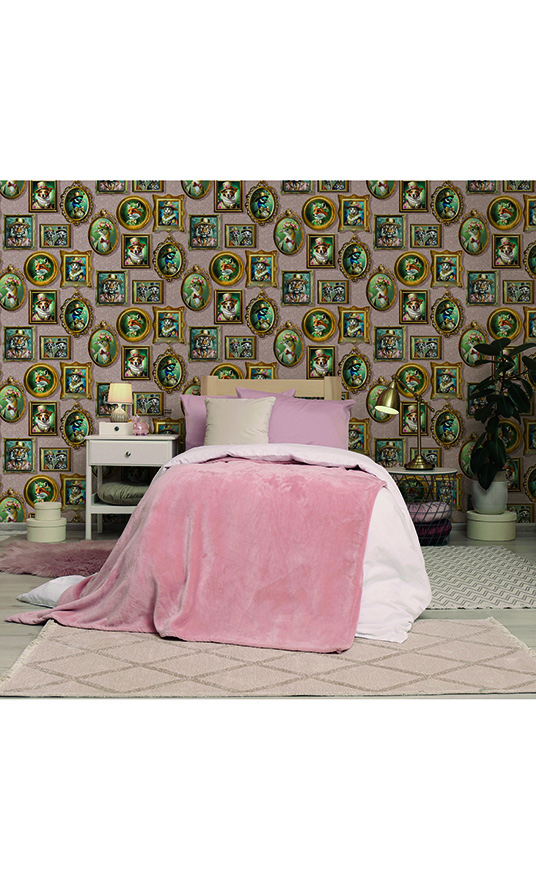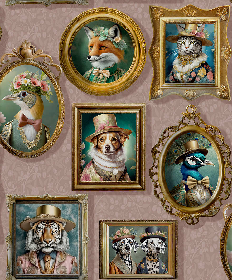 Auf der Tapete REGAL BEASTS sehen sie eine humorvolle Ahnengalerie von unterschiedlichen Tieren in farbiger Kleidung. Die Rolle hat eine Länge von 10,05 Meter und eine Breite von 53 cm. Der Musterrapport beträgt 64 cm. Sie ist in pink ( rose ), blau, zartgrün und schokobraun erhältlich.