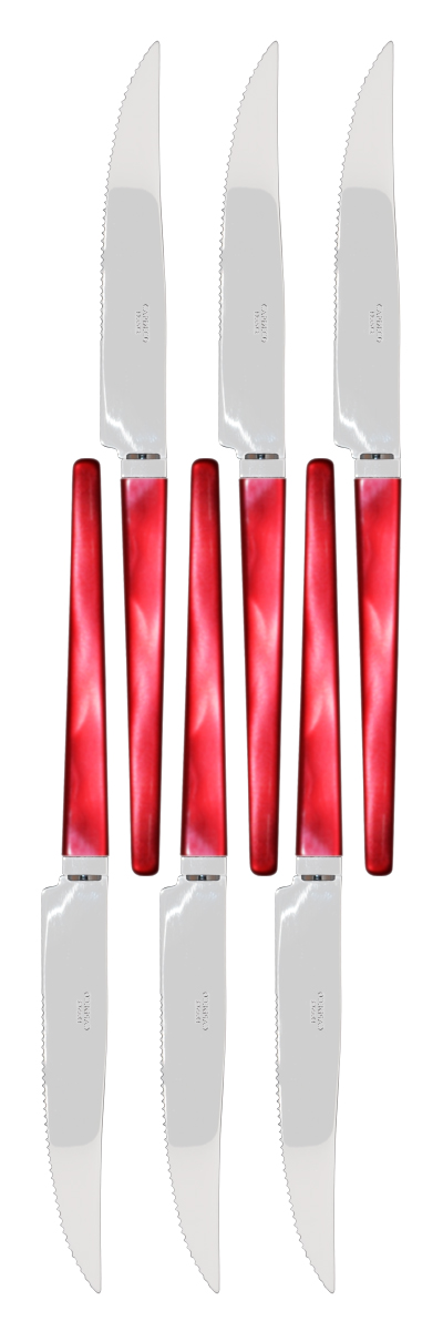 Steakmesser - Set ( 6 Stück ) aus der Serie QUIO in der Farbe lagune / türkis. Die Bestecke des französischen Herstellers CAPDEKO sind aus Acryl und aus rostfreiem Stahl.