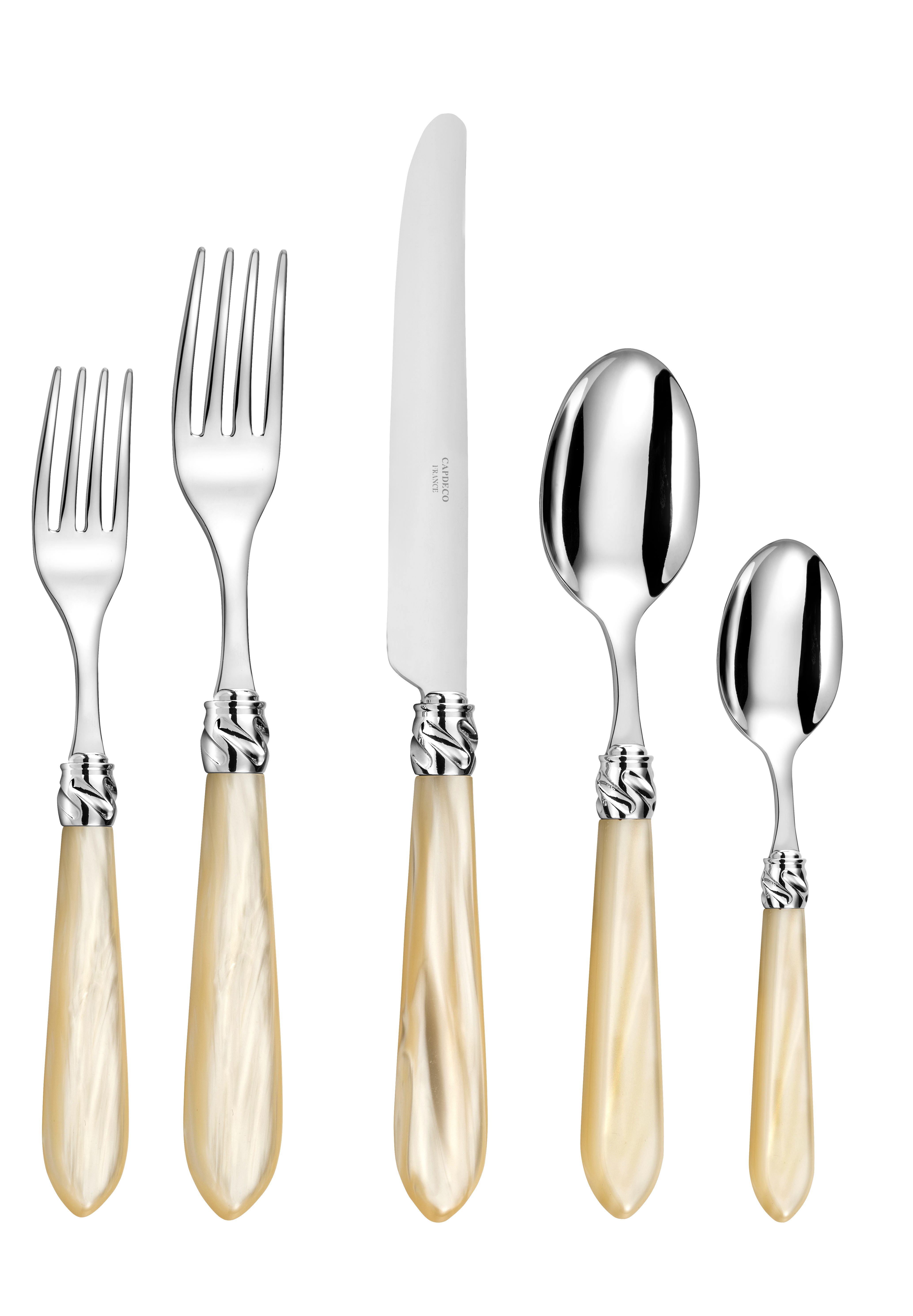 CAPDEKO, Kuchen - Set ( 7 Teile ) aus der Serie DIANA in der Farbe creme. Das Set besteht aus 6 Kuchengabeln und einem Tortenheber. Die Bestecke des französischen Herstellers sind aus Acryl und aus rostfreiem Stahl.