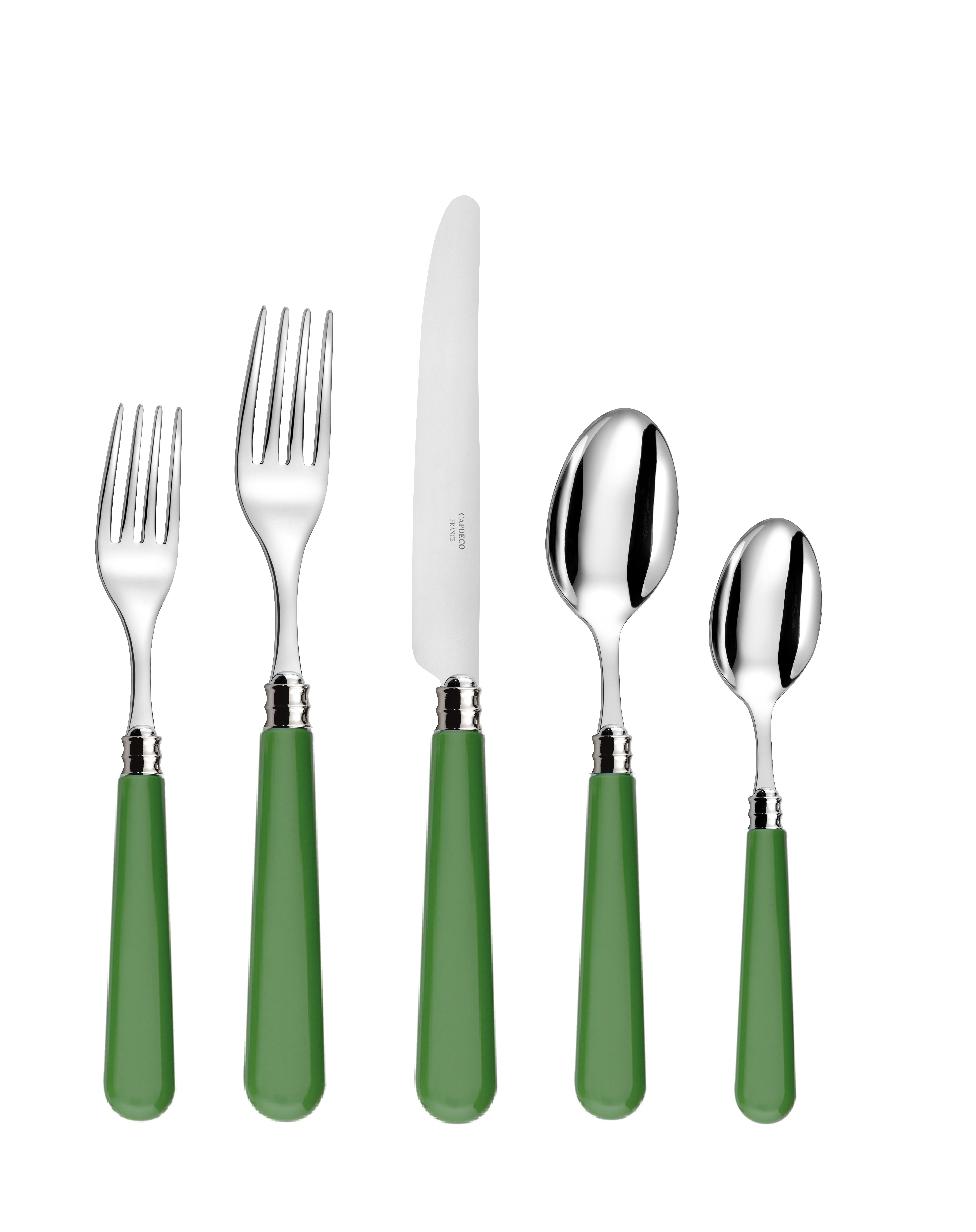 Schlichtes Besteck - Set ( 24 Teile ) mit abgerundetem Griff aus der Serie HELIOS in der Farbe blattgrün. Das Besteck des französischen Herstellers CAPDEKO ist aus mattem Acryl und aus rostfreiem Stahl.