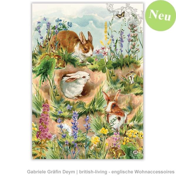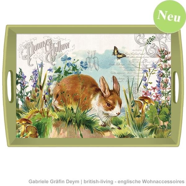 Eckige Glasschale / Seifenschale BUNNY HOLLOW von Michel Design Works. Die bunte Schale hat zwei Hasen als Motiv und eine Größe von 12 x 16 cm.