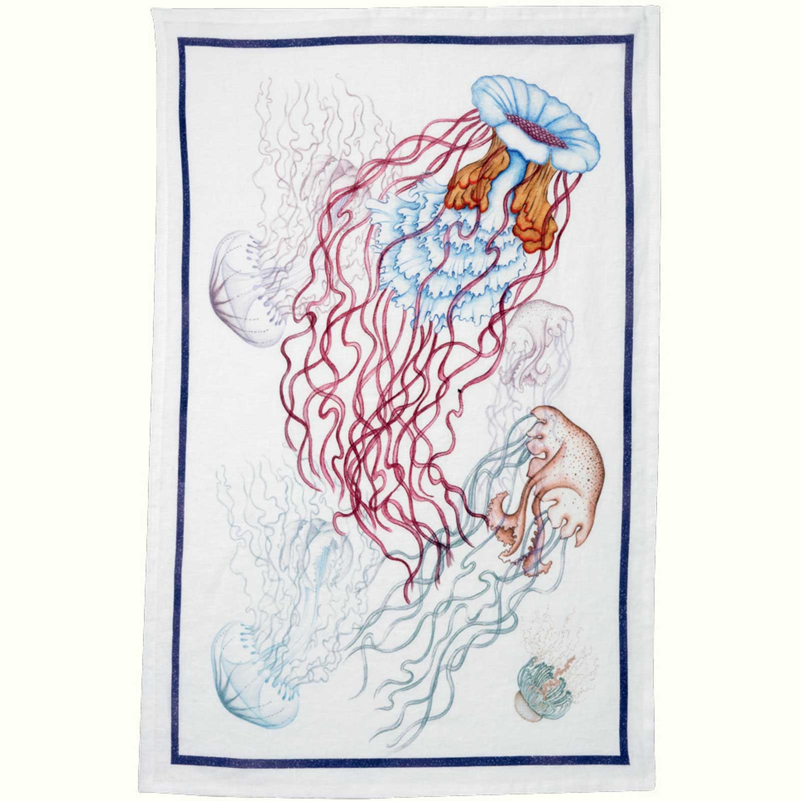 Das Geschirrtuch - Set mit blauem Rand hat Medusen ( Quallen ) als Motiv. Das Set beinhaltet 2 Geschirrtücher mit gleichem Motiv. das Tuch hat eine Größe von 50 x 70 cm.