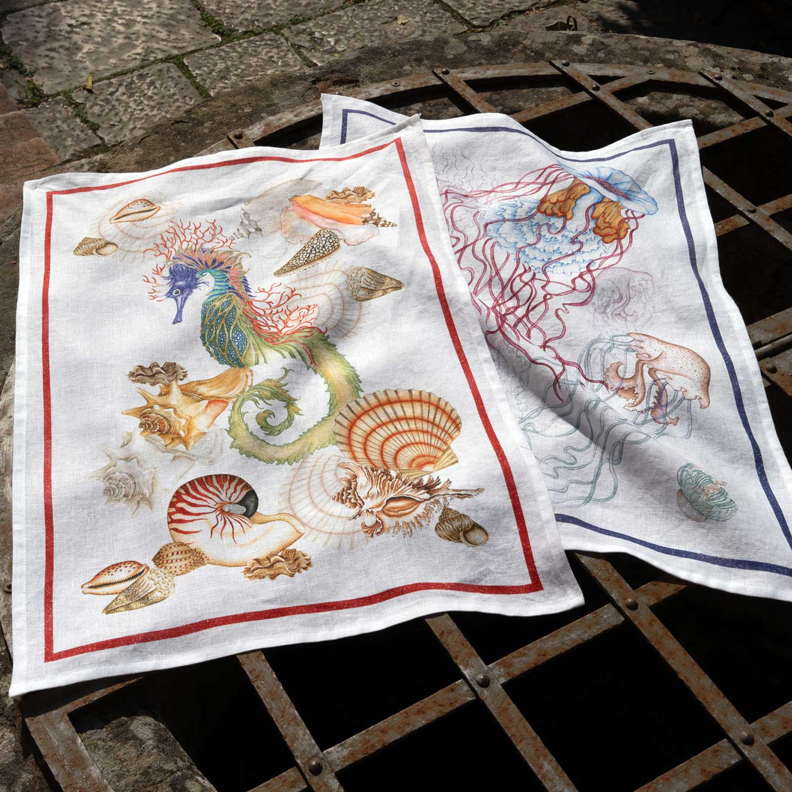 Scheinbar schwebende Medusen, Seepferdchen und Muscheln sind das Motiv auf JELLY in zarten Farben auf weichem Hanf.