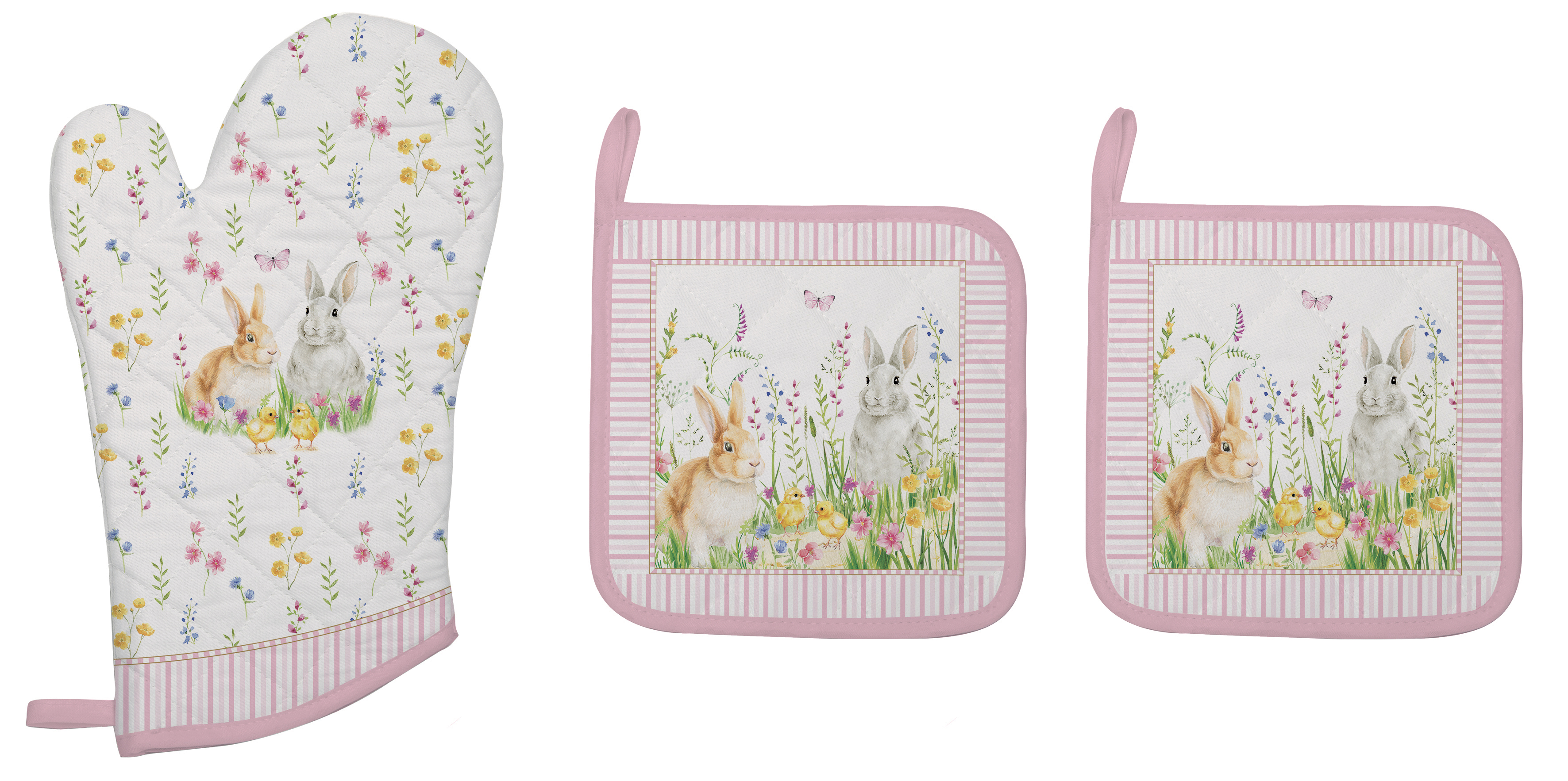 Das 5 teilige Set beinhaltet 2 Topflappen in 20 x 20 cm, 1 Ofenhandschuh in 20 x 30 cm und 2 Geschirrtücher in 50 x 70 cm. Alles ist aus reiner Baumwolle.