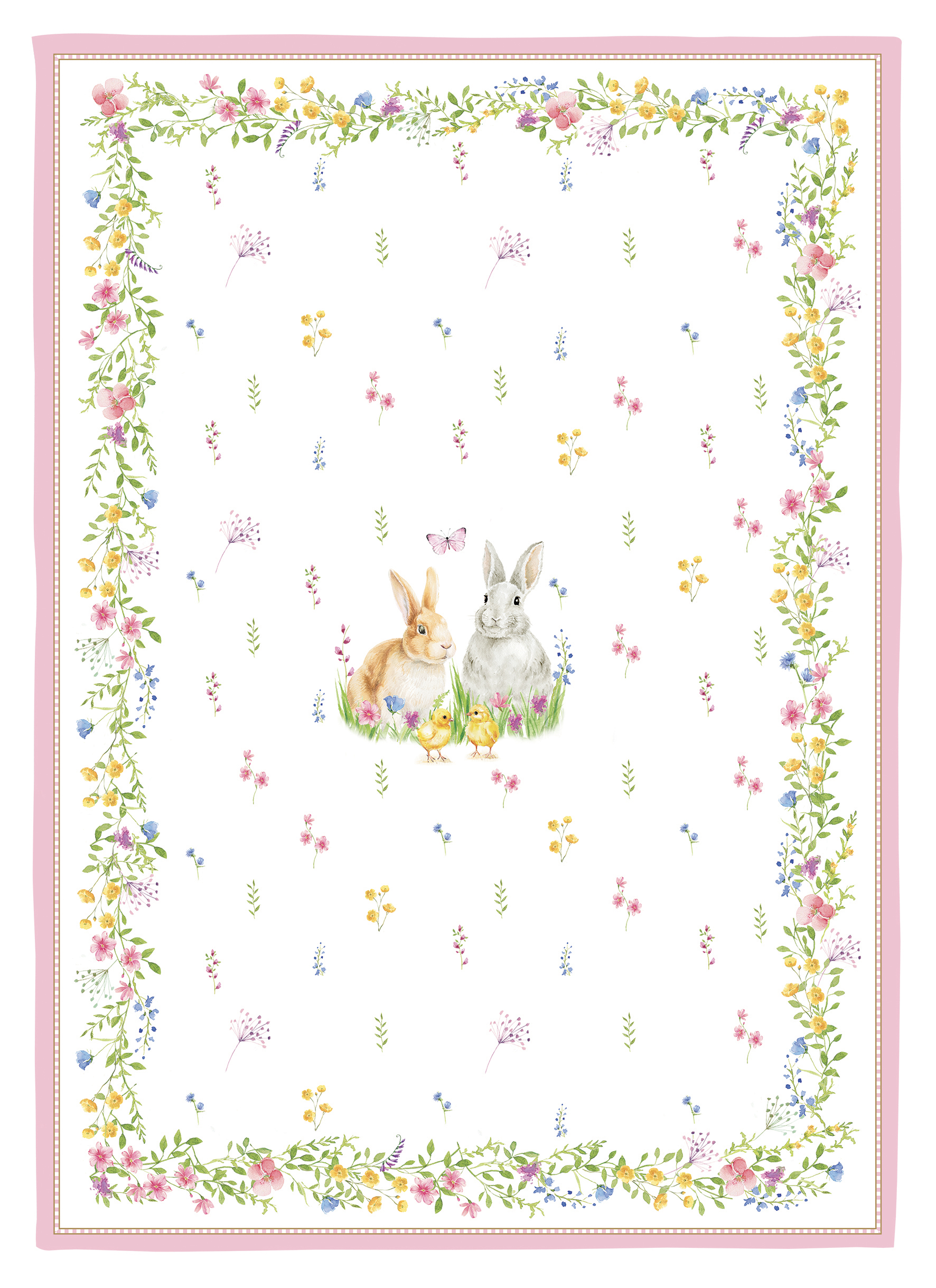 Für einen frühlingshaft gedeckten Ostertisch passt das Dessin HAPPY EASTER. Neugierige Hasen, pastellfarbene Frühlingsblüten und zarte Streifen ergeben ein fröhliches Ostermotiv.
