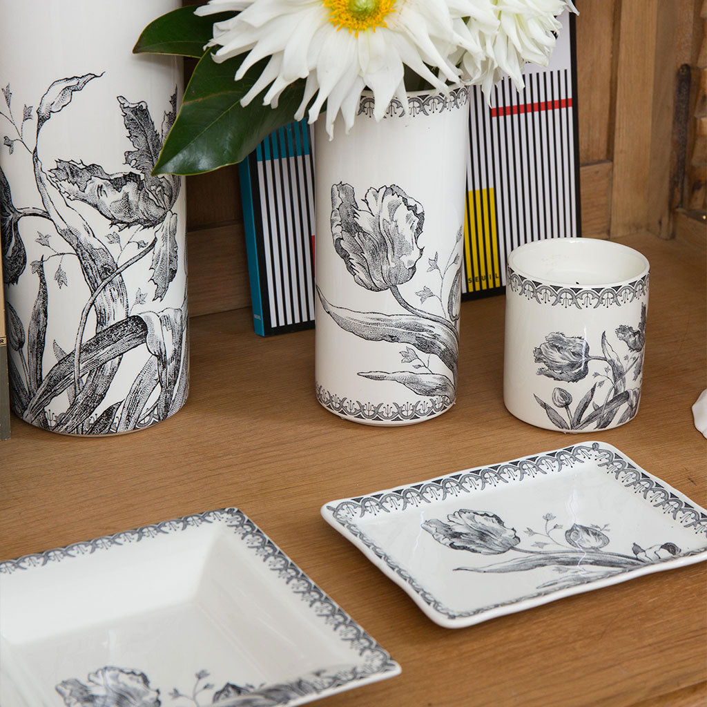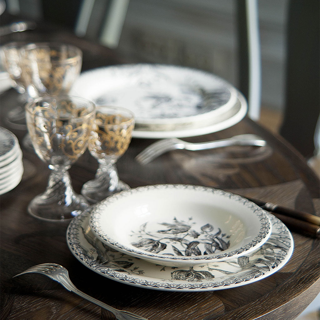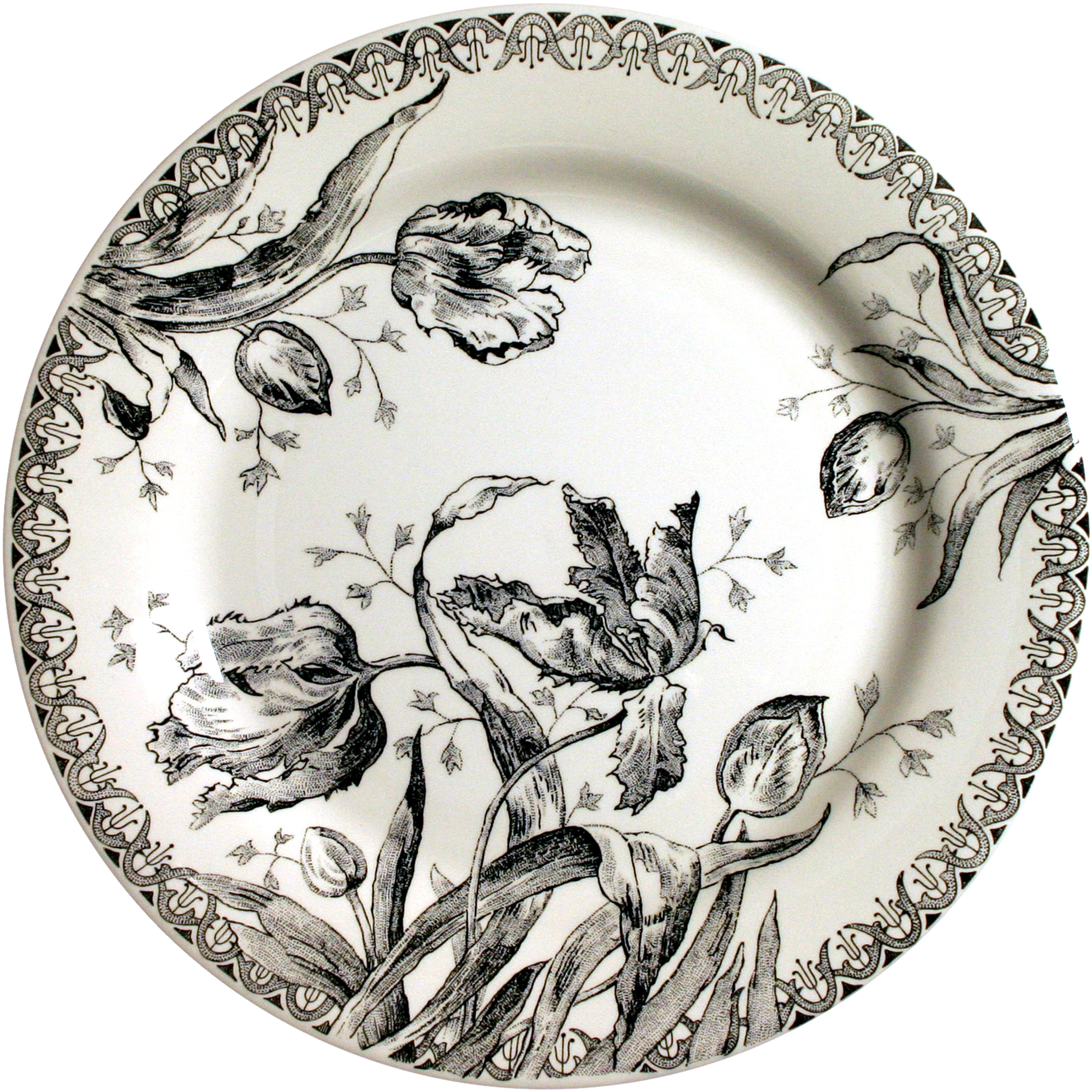 Speiseteller - Set ( 4 Stück ) der zeitlosen, extravaganten Frühlingsserie TULIPES mit einem Tulpenmotiv in schwarz.