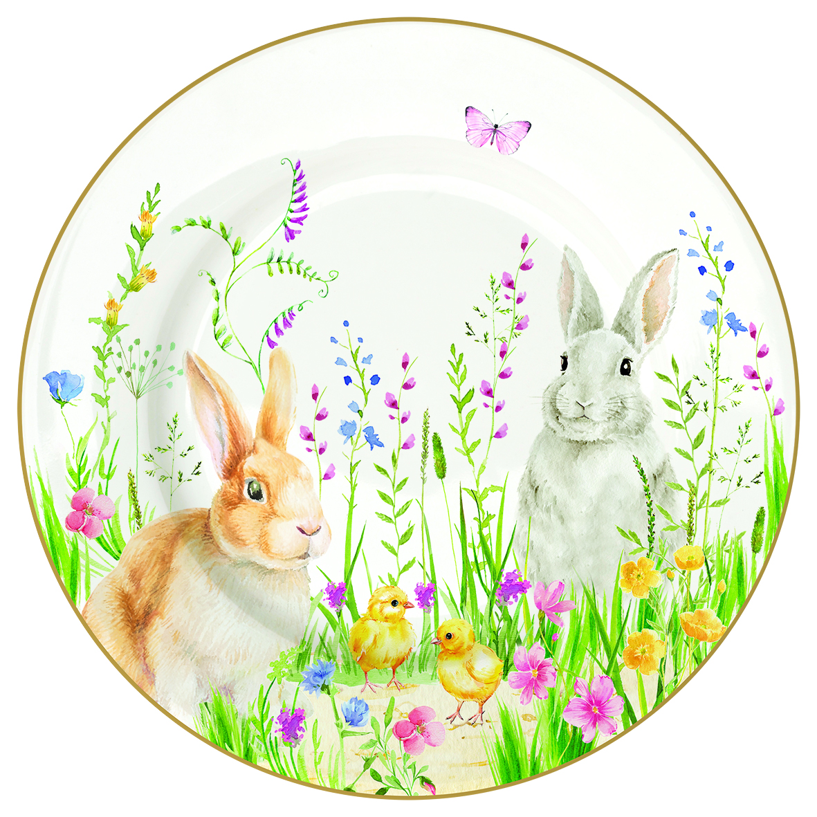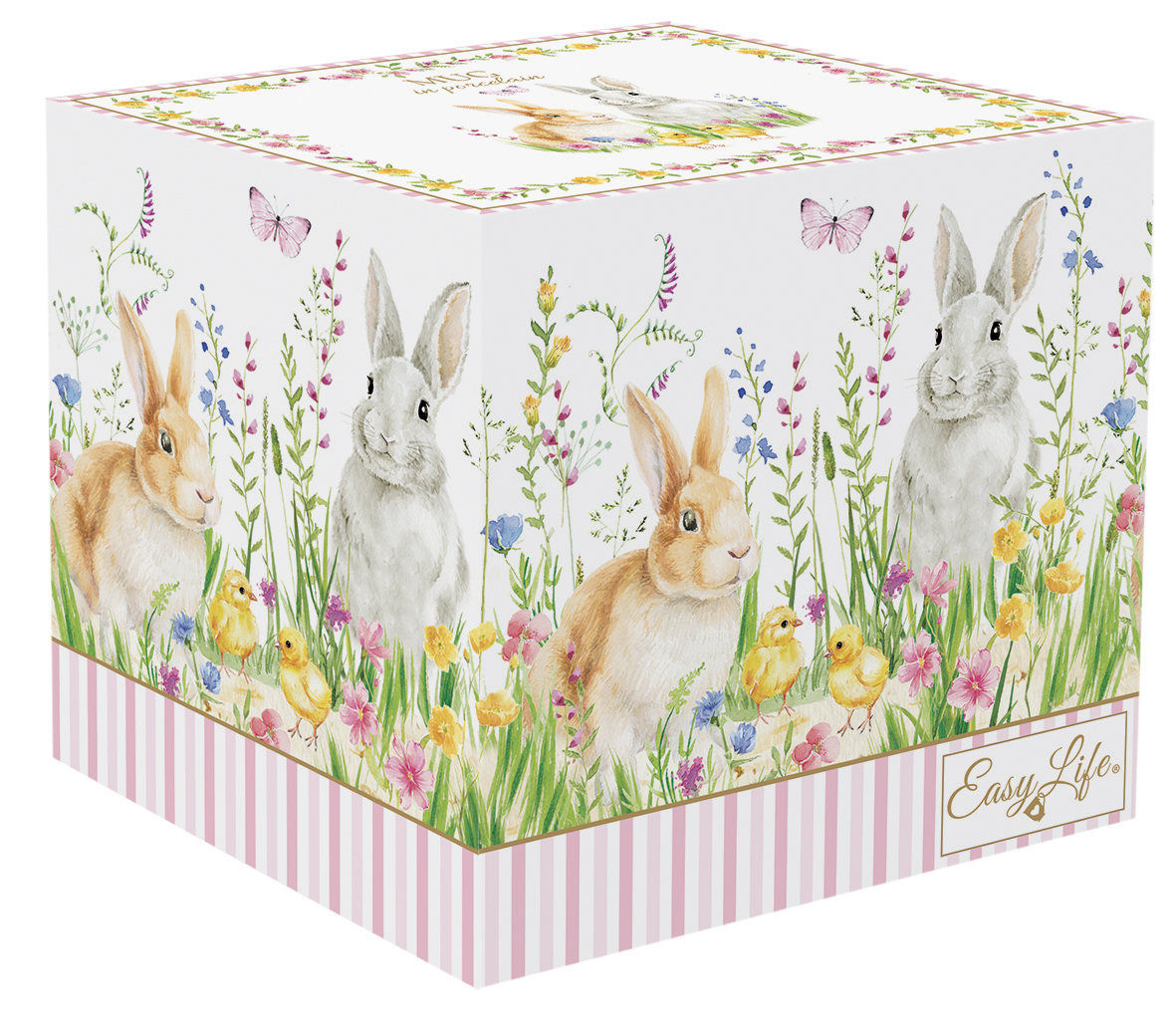 Für einen frühlingshaft gedeckten Ostertisch passt das Dessin HAPPY EASTER. Neugierige Hasen, pastellfarbene Frühlingsblüten und zarte Streifen ergeben ein fröhliches Ostermotiv.