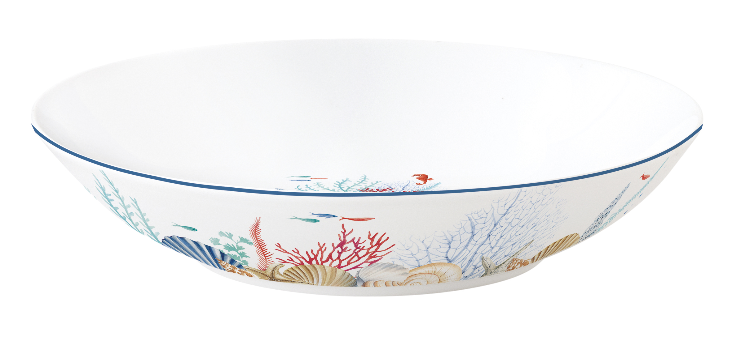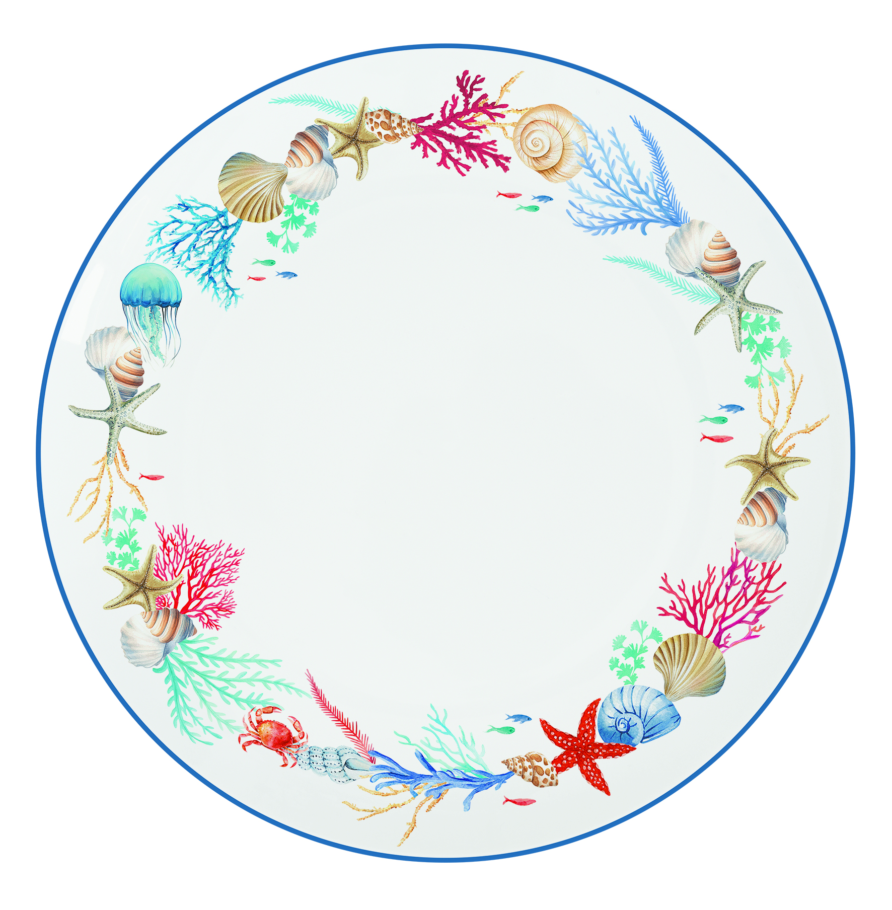 SEA BREEZE ist ein mehrfarbiges martimes Dessin mit roten Korallen, Muscheln, Seestern und Meerespflanzen.