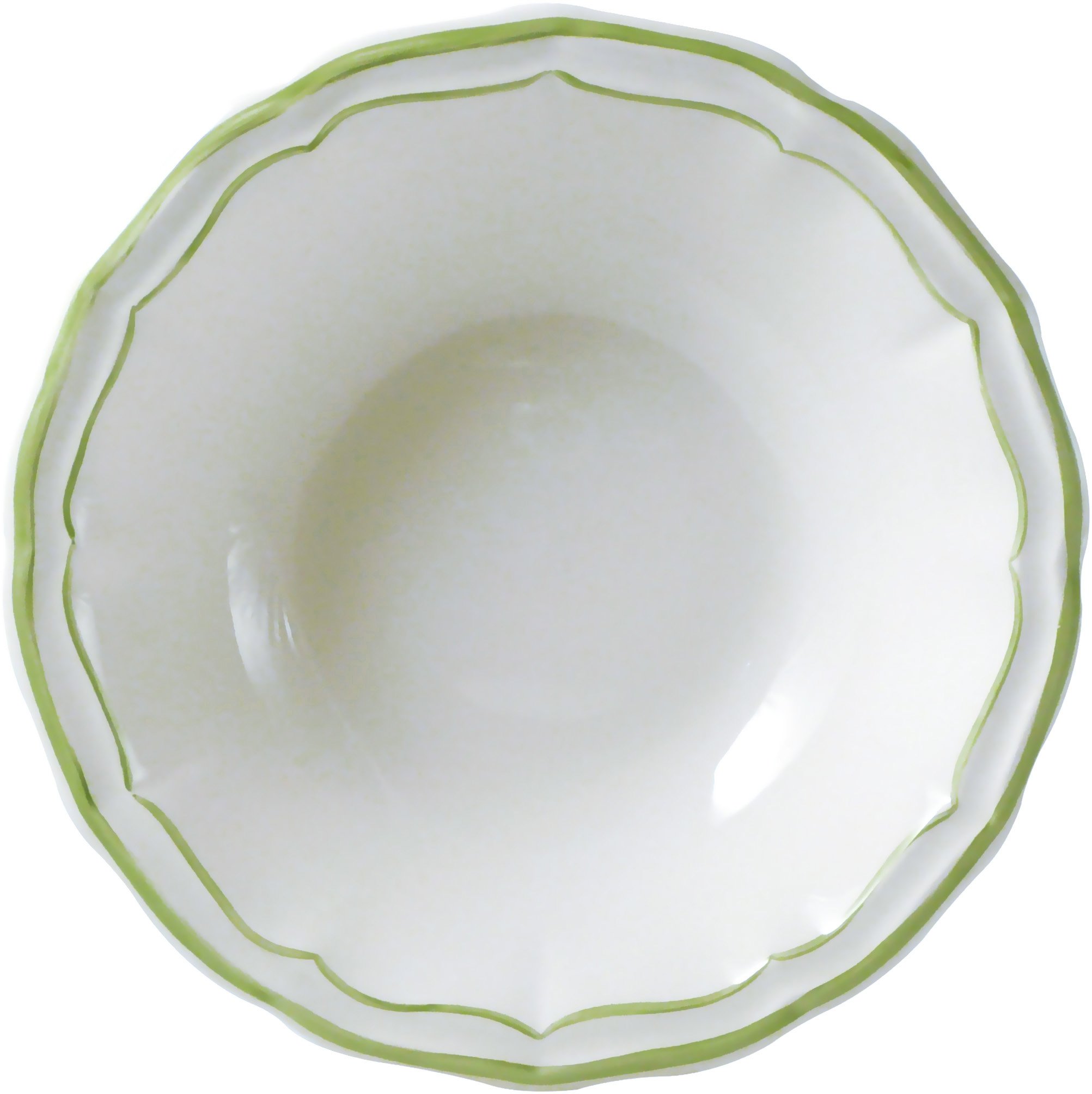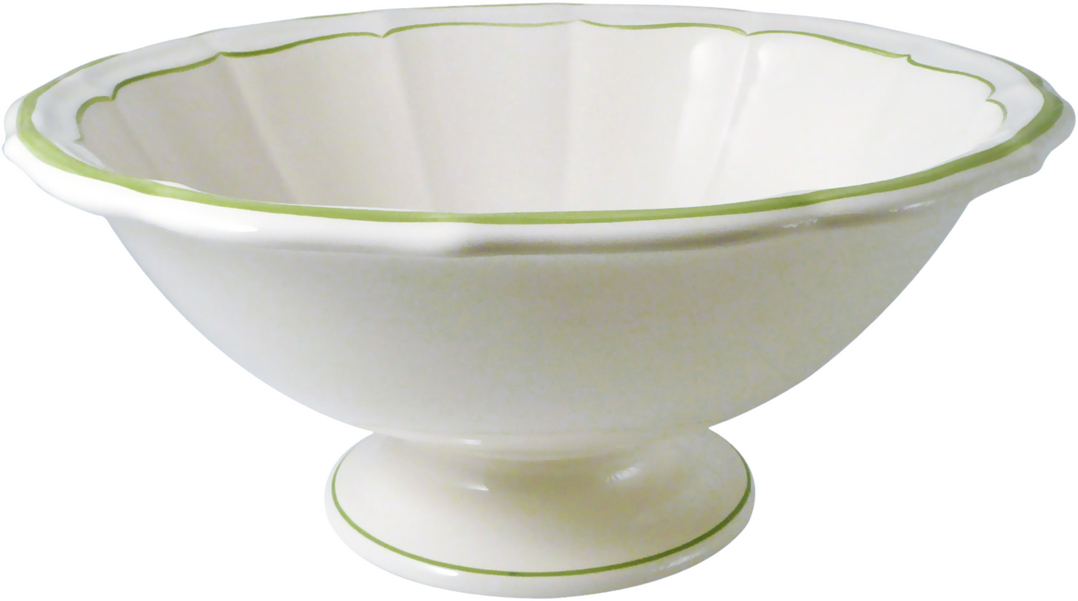 GIEN, Salatschüssel mit Fuß aus der Geschirrserie FILET VERT in creme mit handgemaltem hellgrünem Rand. Die Schale auf Fuß hat ein Fassungsvermögen von 2 L und einen Durchmesser von 30 cm. Viele weitere Ergänzungsteile erhältlich. Typisch französisches Landhausgeschirr.
