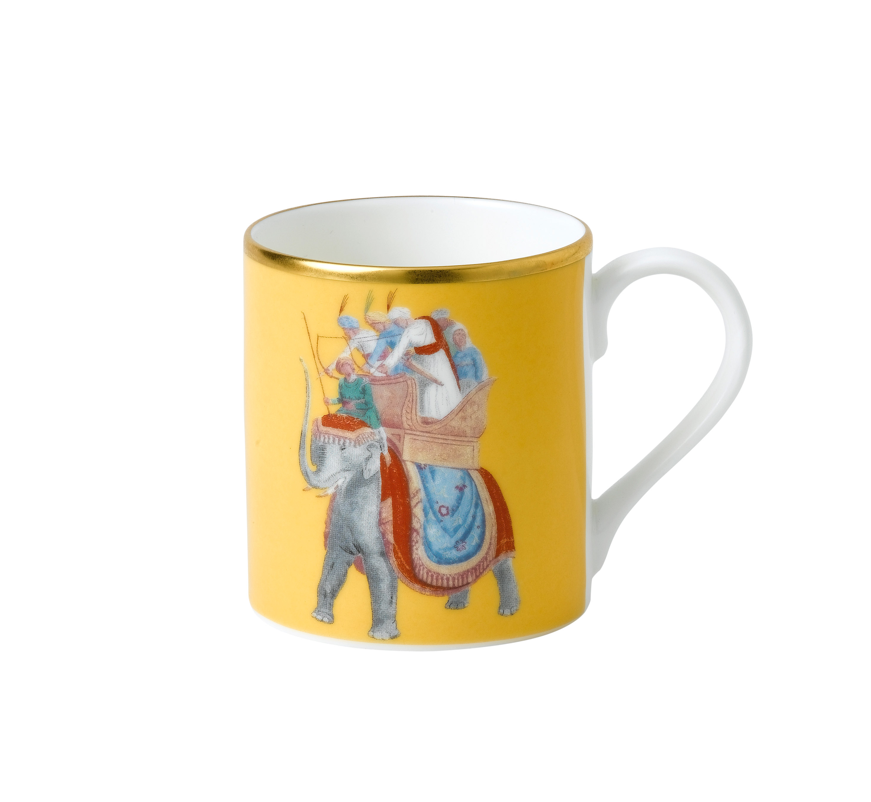 Der Henkelbecher in der Farbe hellgelb hat einen geschückten Elefanten als Motiv. Höhe 8,5 cm, Inhalt 240 ml. Das Set beinhaltet 4 Becher.