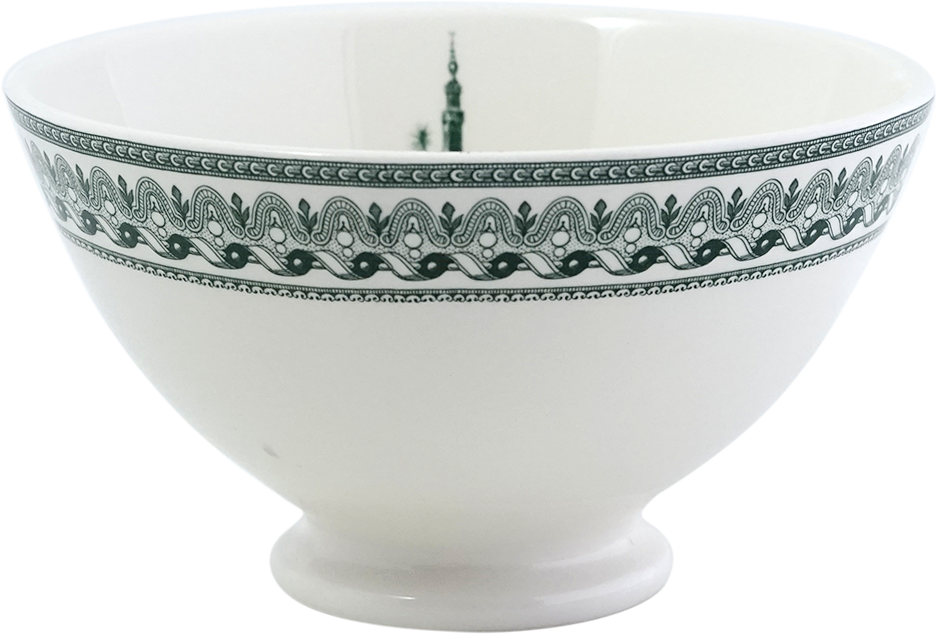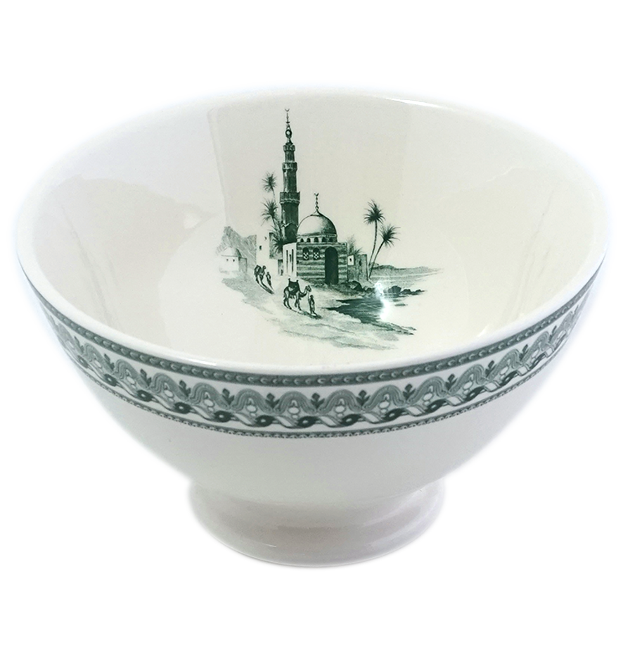 LES DEPAREILLEES ist ein Dekor in creme und dunkelgrün, u.a. mit Palmen Kamelen und orientalischem Gebäude. Die Dekore der französischen Fayence sind unter Glasur und somit spülmaschinenfest.