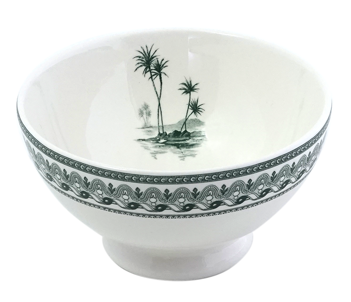 LES DEPAREILLEES ist ein Dekor in creme und dunkelgrün, u.a. mit Palmen Kamelen und orientalischem Gebäude. Die Dekore der französischen Fayence sind unter Glasur und somit spülmaschinenfest.