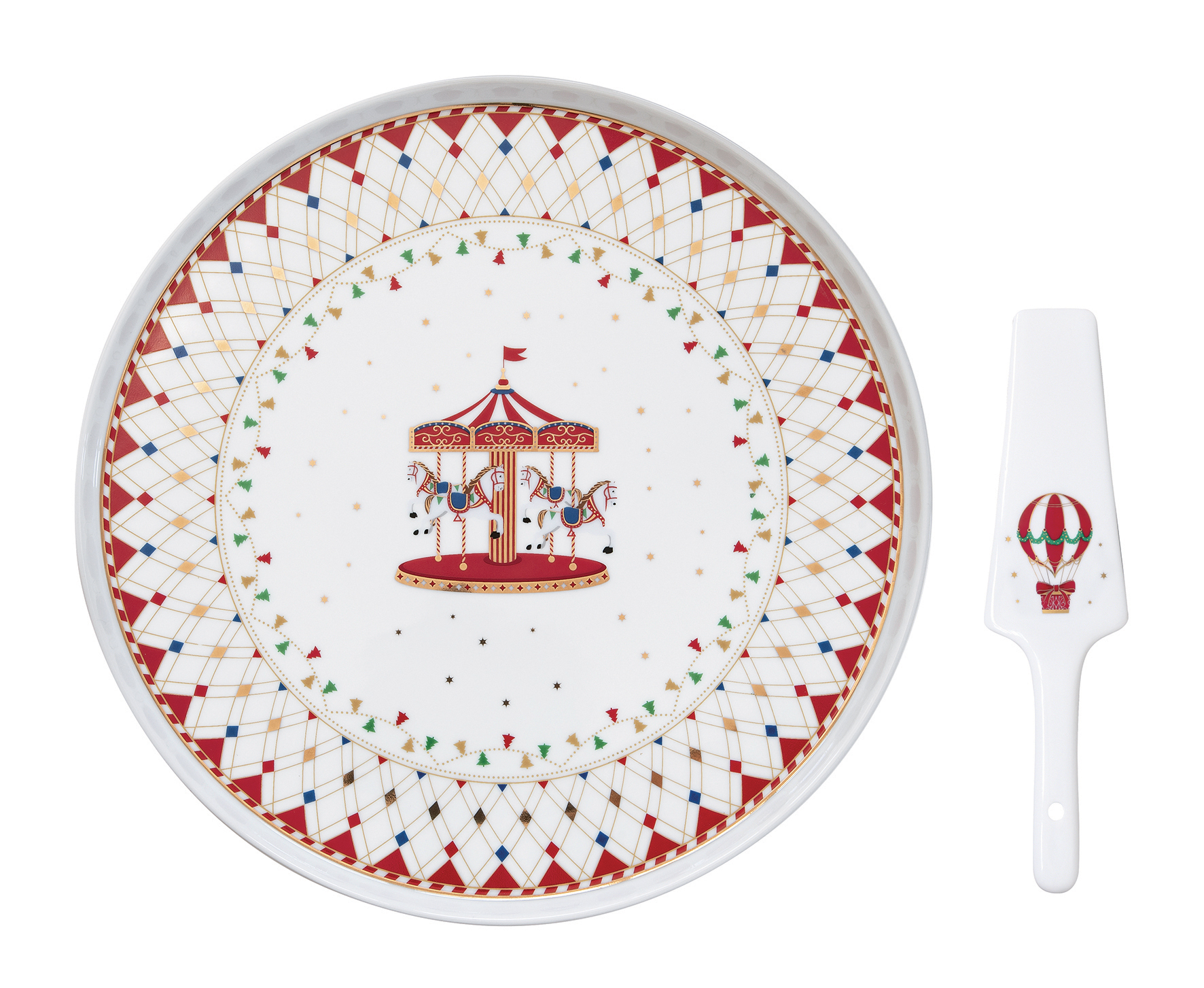 Die Tortenplatte hat einen Durchmesser von 32 cm. Das Motiv auf der Porzellanplatte ist das nostalgische Karussel. Der passende Tortenheber hat den Ballon als Motiv.. Die Kuchenplatte wird in einer dekorativen Geschenkbox geliefert.