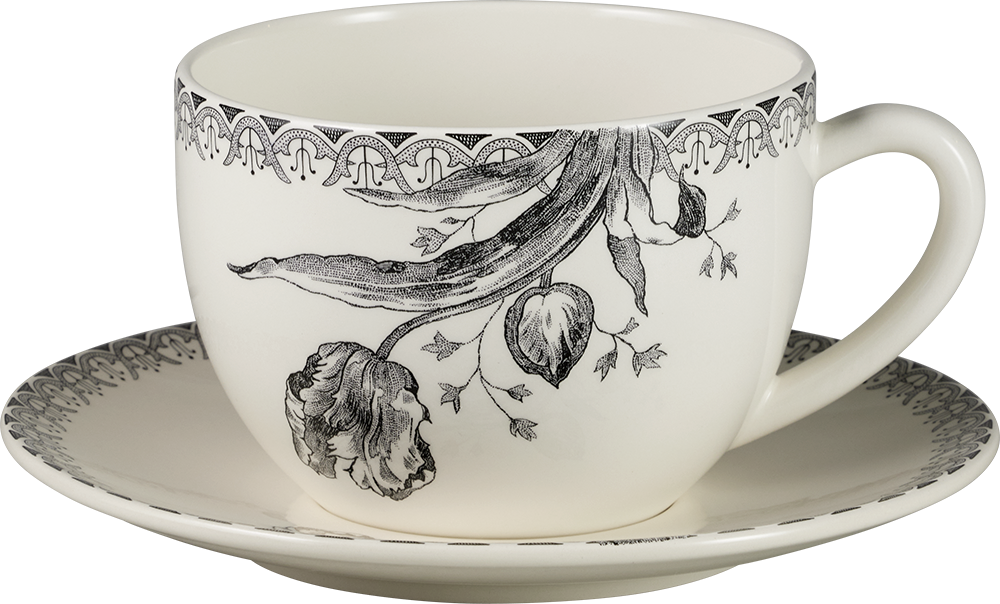 Jumbotasse mit Untertasse aus der Geschirrserie TULIPES NOIRES von GIEN. Das ist ein zeitlos extravagantes Landhausgeschirr aus Frankreich. Das Dekor ist unterglasur, somit spülmaschinenfest.