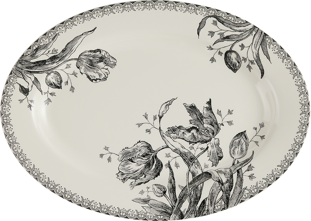 Ovale Platte aus der zeitlosen, extravaganten Frühlingsserie TULIPES NOIRES mit einem Tulpenmotiv in schwarz.