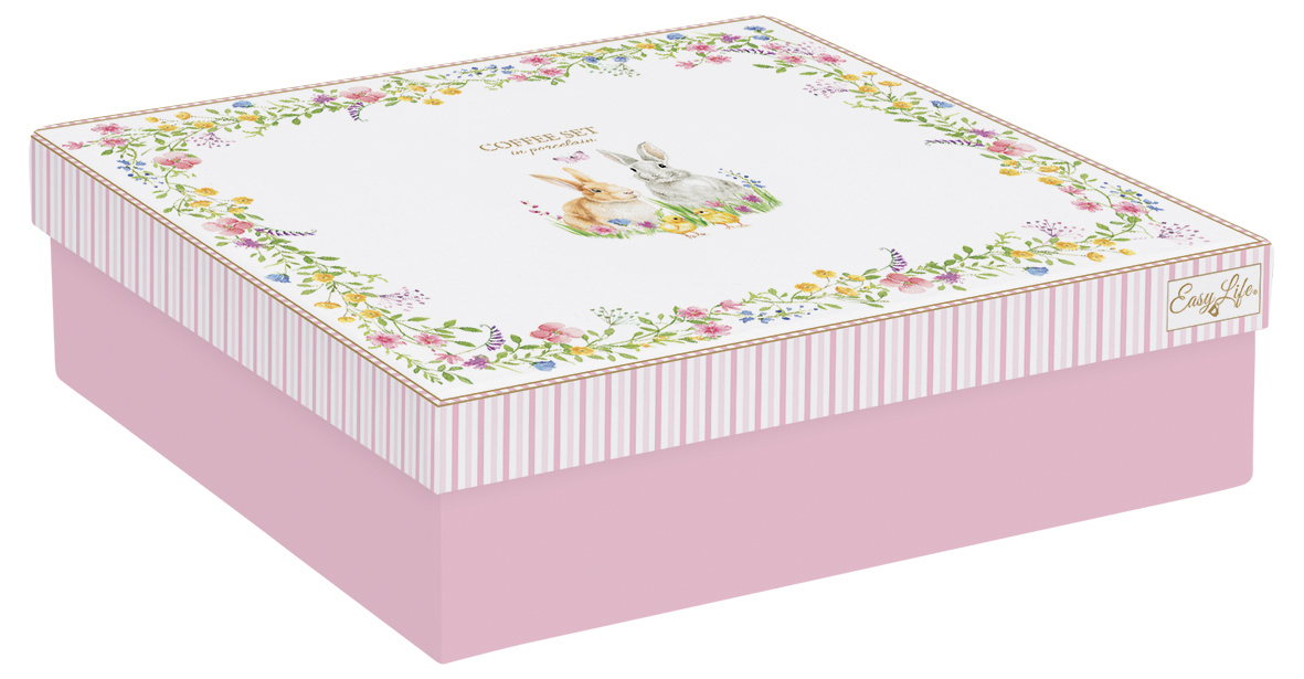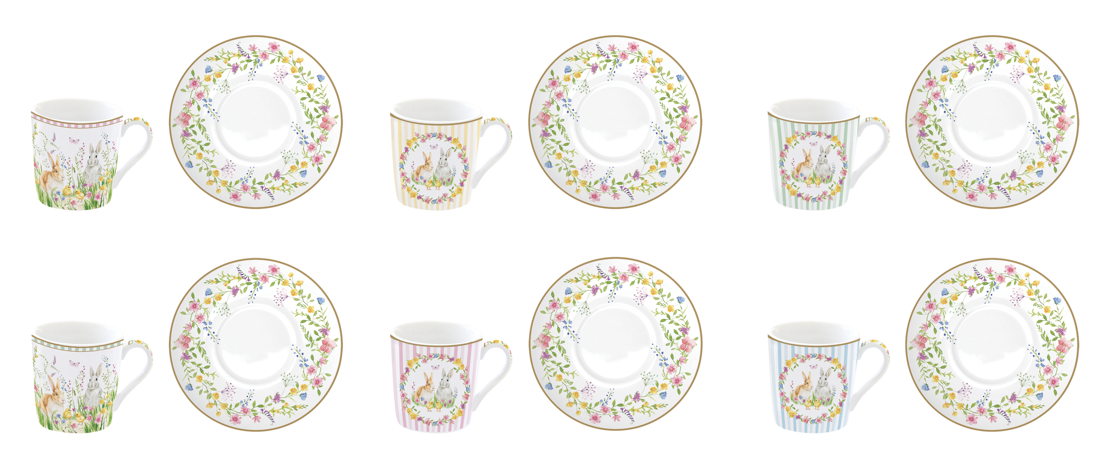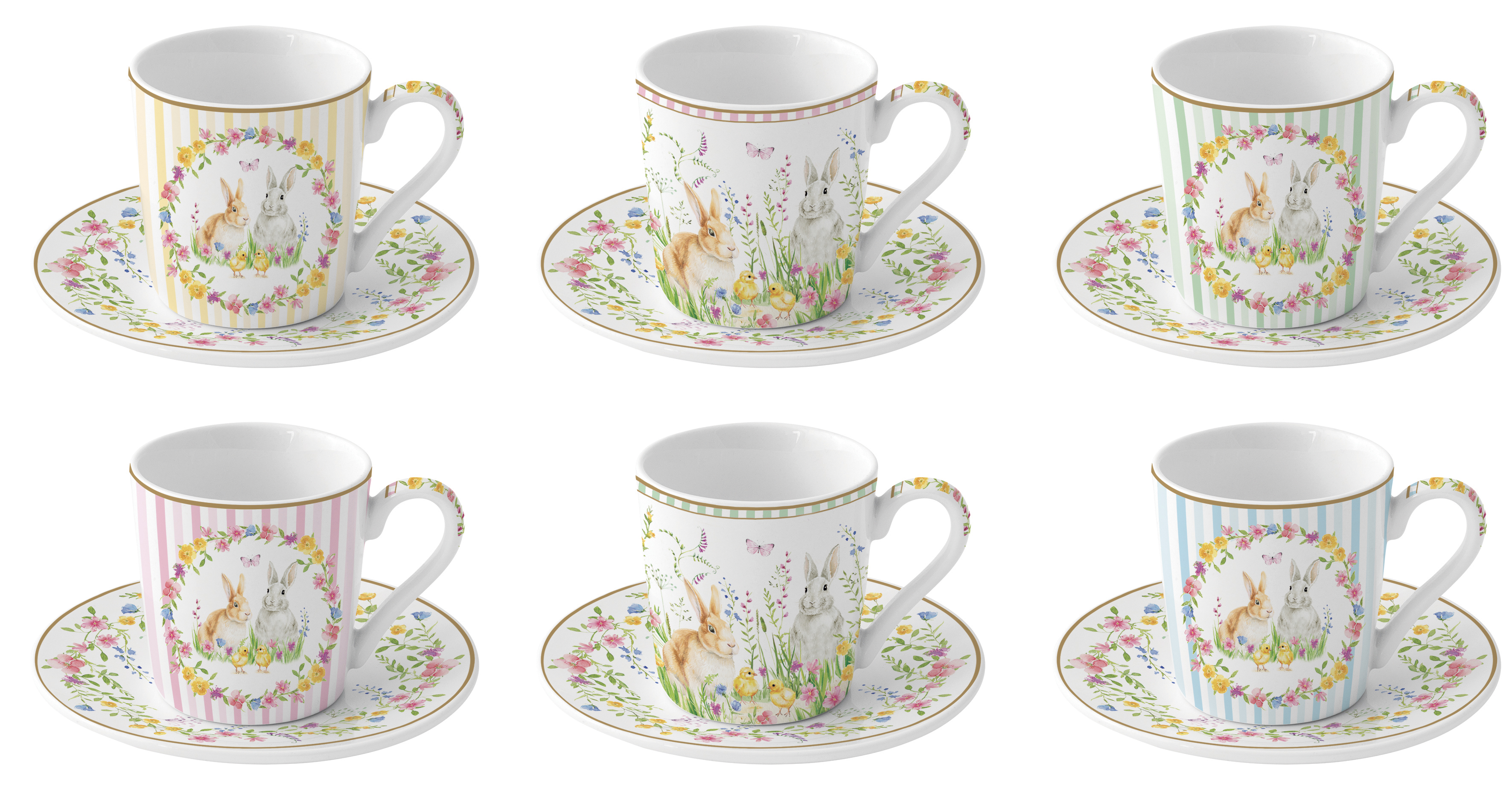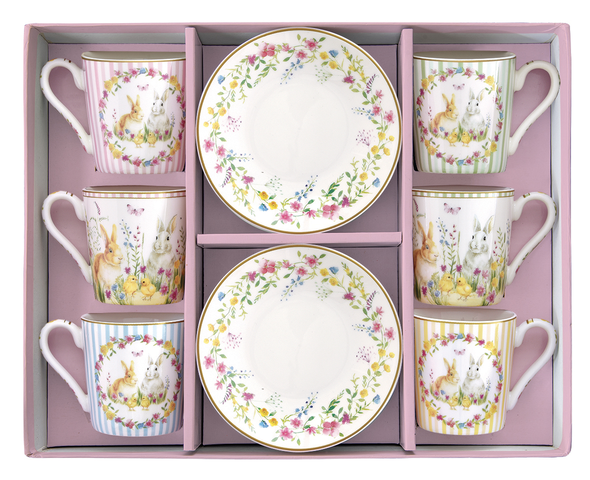 Das Espressotassen - Set aus Porzellan besteht aus 2 Tassen mit Blüten und Hasenpaar und 4 Tassen mit Streifen, Blüten und Hasenpaar als Dekor. Die Espressotasse mit passender Untertasse hat ein Fassungsvermögen von 100 ml. Sie werden in einer Geschenkbox geliefert.