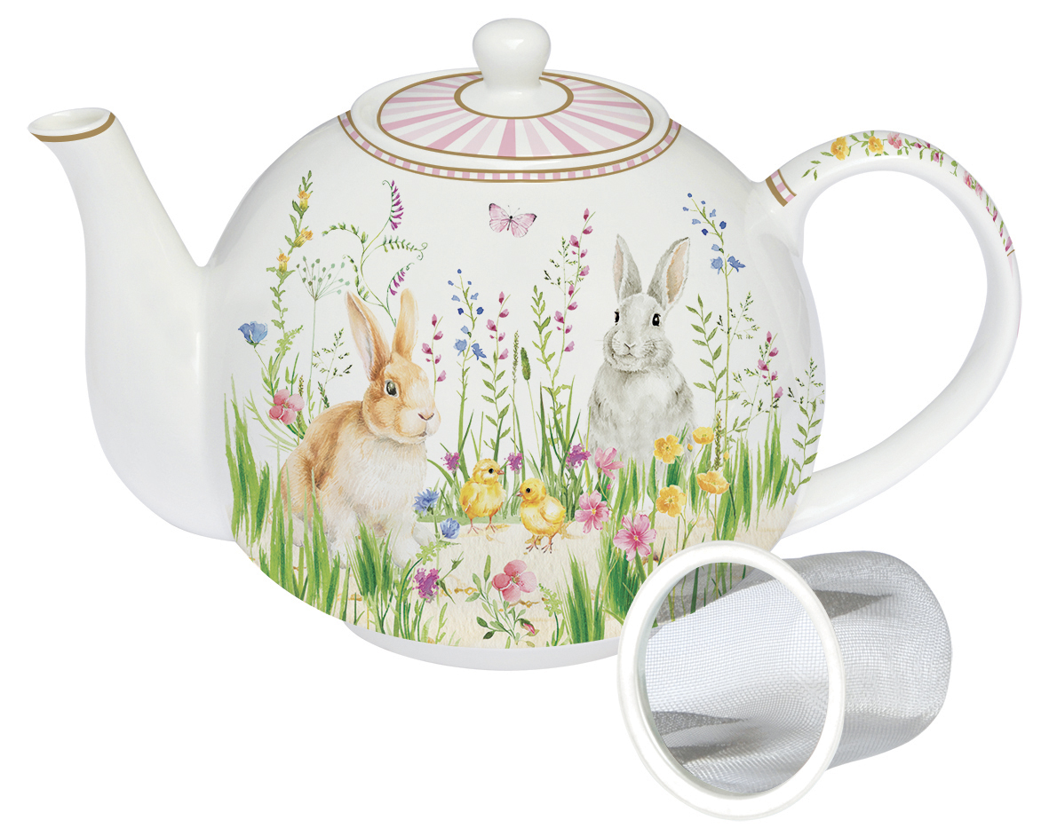 Die Teekanne aus Porzellan hat einen Inhalt von 1,0 Liter. Die Kanne mit passendem Metallsieb hat das Blüten - und Hasendekor, der Deckel ein Streifenmuster in rosa. Sie wird in einer Geschenkpackung geliefert. Nur noch die Gäste einladen zu einer gemütlichen Teestunde.