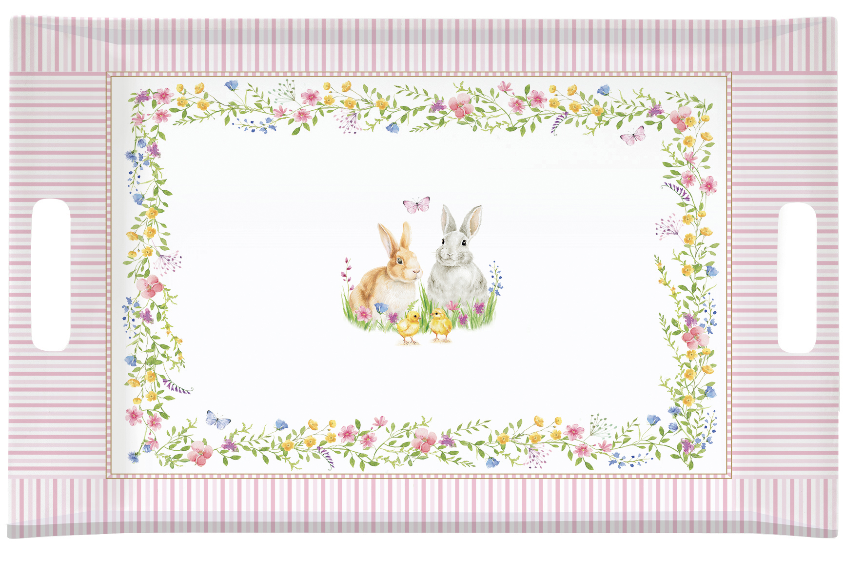 Auch ein Tablett gehört zu dieser Geschirrserie. Es hat zwei Grifföffnungen und eine Größe von 31 x 45 cm. Rosa Streifen am Rand, Blüten und ein Hasenpaar sind das Dekor auf dem rechteckigen Tablett. Damit lässt sich das Ostergeschirr gut transportieren.