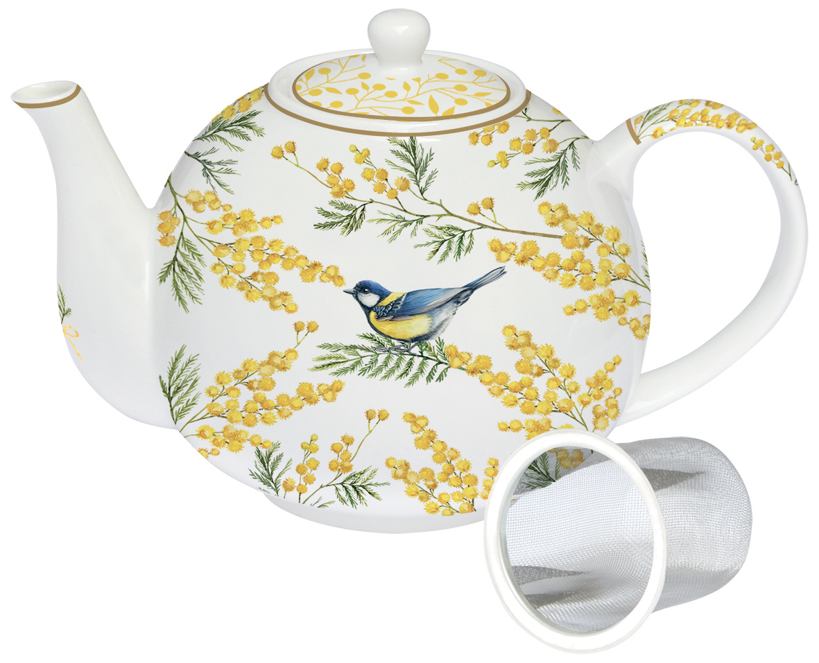 Die Teekanne mit Mimosenzweigen und einer Blaumeise hat einen Inhalt von 1,0 Liter. Auch ein passendes Metallsieb ist dabei. Die Kanne wird in einer dekorativen Verpackung geliefert.