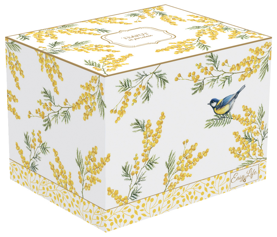 Passend zum Frühling ist das neue Dessin MIMOSA. Auf Porzellan, Melamintabletts und Servietten verzaubert die gelbe Mimose und eine Blaumeise.