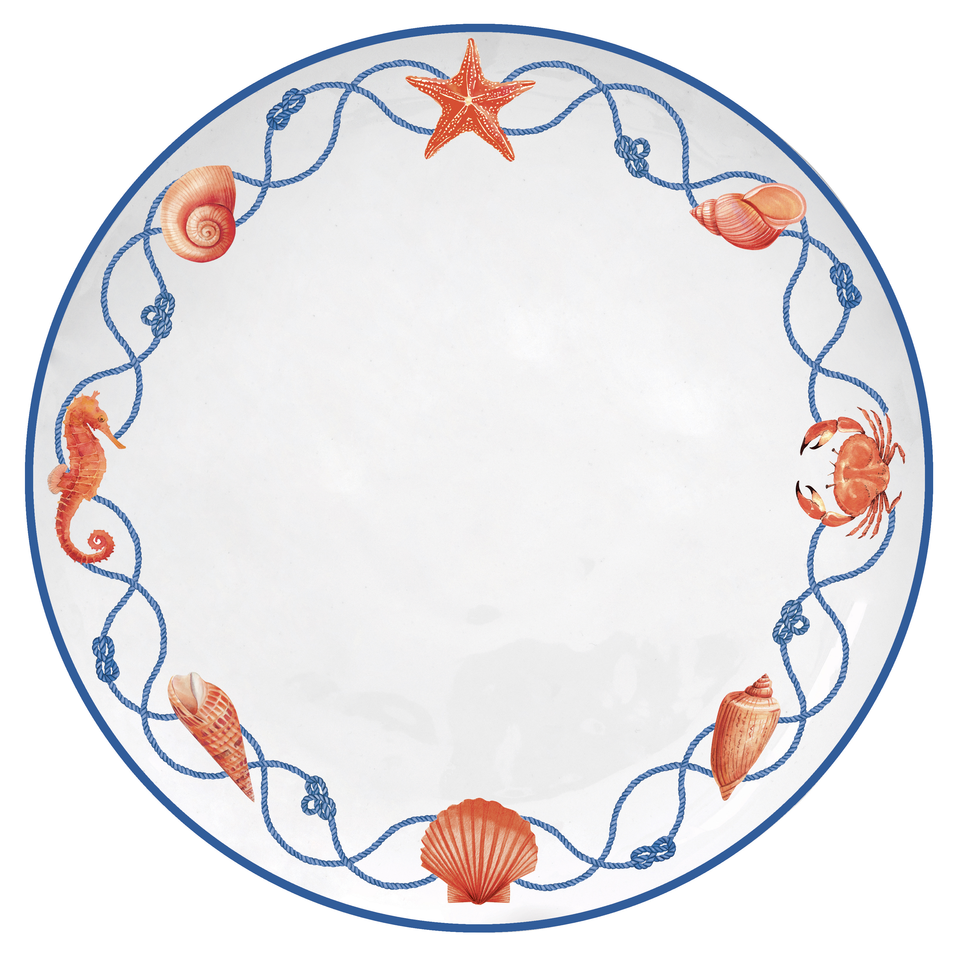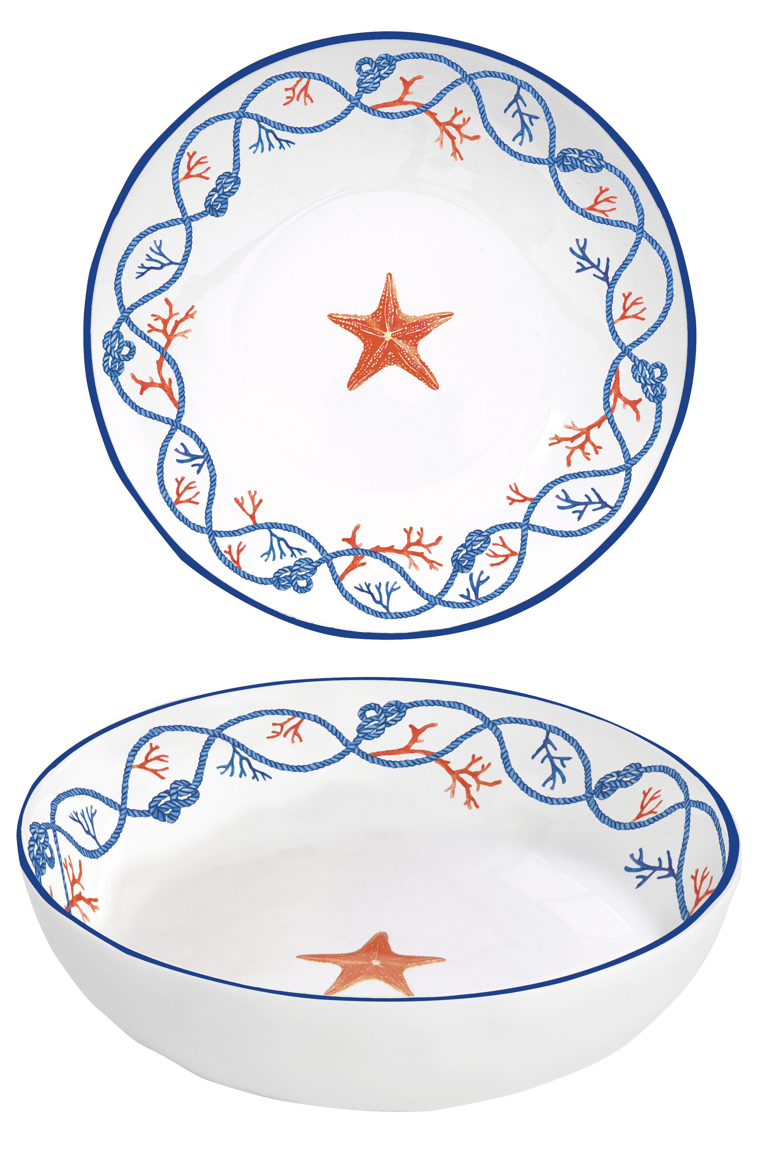 Das Mittelmeer war die Idee zu dem Dessin COTE DE MER. Blaue verschlungene Kordel, rote Korallen, Muscheln, Seestern und Meeresfrüchte sind auf dem Geschirr zu sehen. Alle Teile haben einen schmalen blauen Rand.
