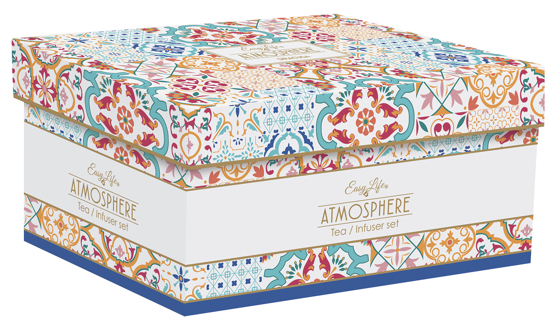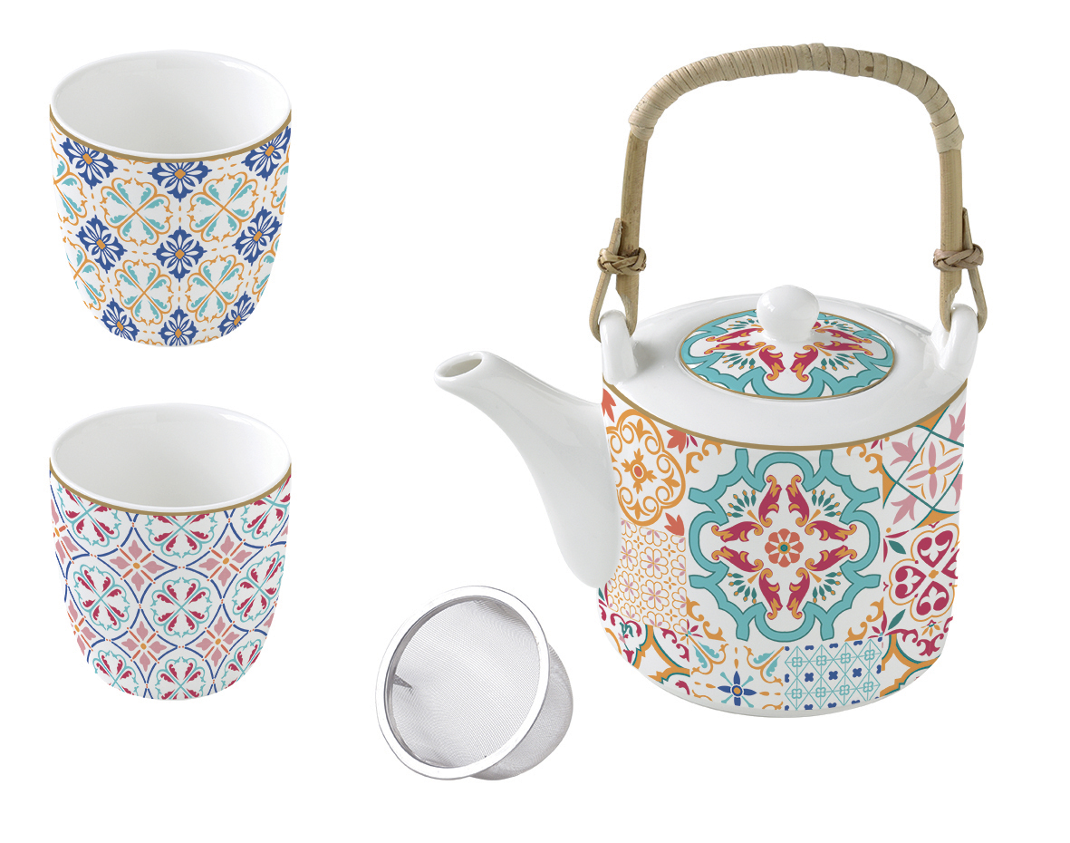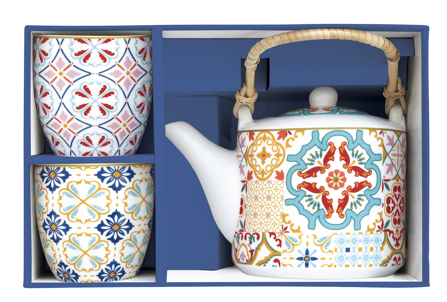 Das 4 tlg. Set besteht aus einer Tekanne, einem Sieb für losen Tee und 2 Becher. Die Kanne hat ein Fassungsvermögen von 600 ml und der Becher von 160 ml. Kanne und Becher haben unterschiedliche Muster. Das Set wird in einer dekorativen Geschenkpackung geliefert.