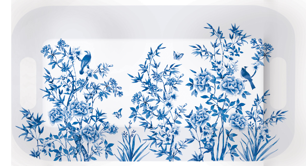 PARADISE GARDEN ist ein leicht asiatisches Motiv mit Vögeln, Pfingstrosen Schmetterling und Gräser. Alles in königsblau mit schmalem Goldrand auf weißem Porzellan.