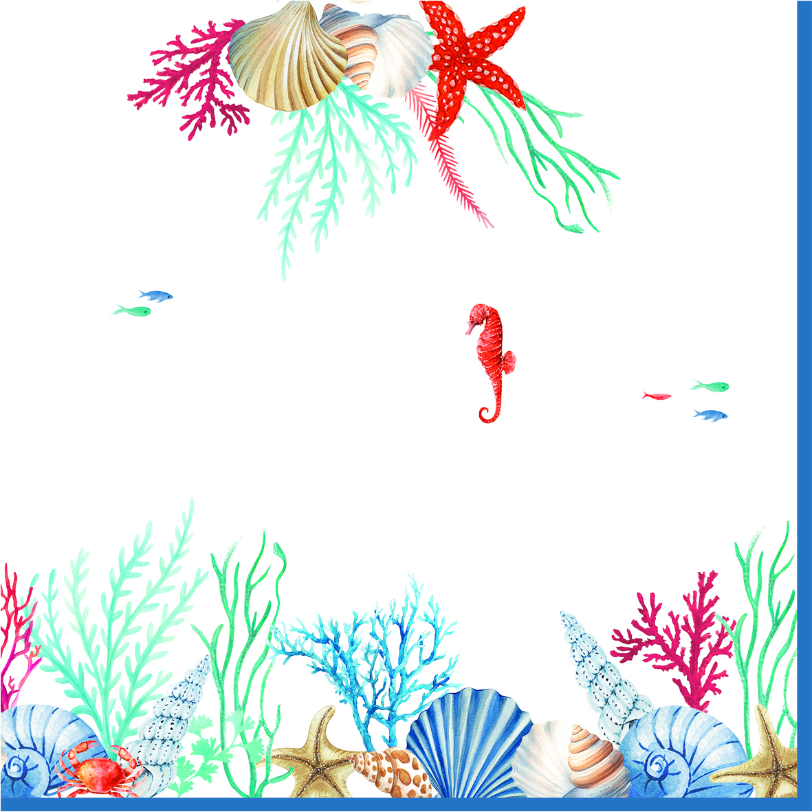 SEA BREEZE ist ein mehrfarbiges martimes Dessin mit roten Korallen, Muscheln, Seestern und Meerespflanzen.
