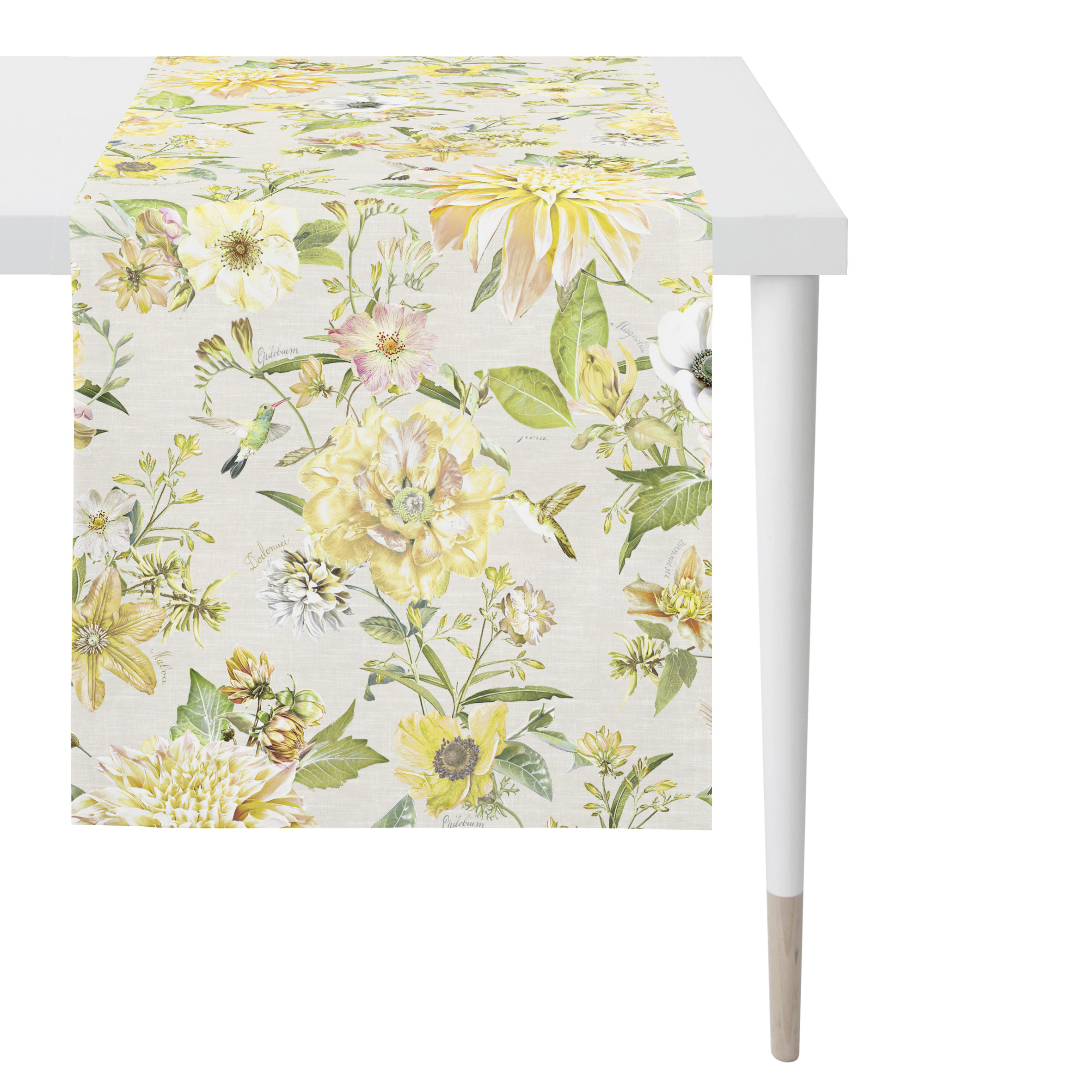 Der Tischläufer in gelb-orangetöne auf eierschalfarbenem Grund hat eine Größe von 50 x 140 cm und wird mit einer Briefecke genäht. Das Dessin sorgt für eine sommerliche Stimmung am Tisch.
