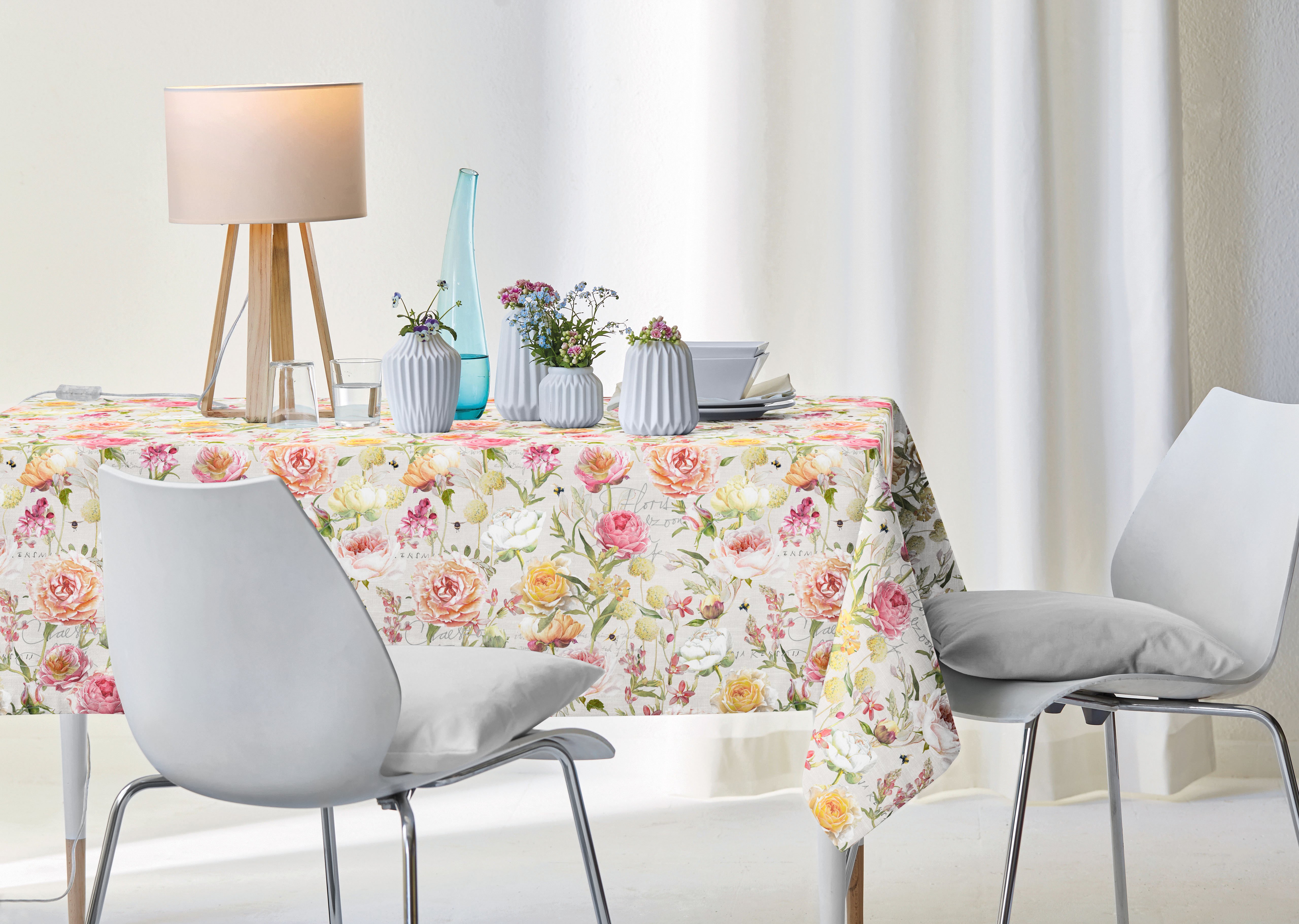 Auch Romy Schneider hätte dieses Rosenmuster ( Artikel 7701 ) von APELT sicherlich gut gefallen. Das Dessin ist in drei Farbstellungen als Tischwäsche und Kissen erhältlich. In der Farbe 38 auch als Bettwäsche ROMY.