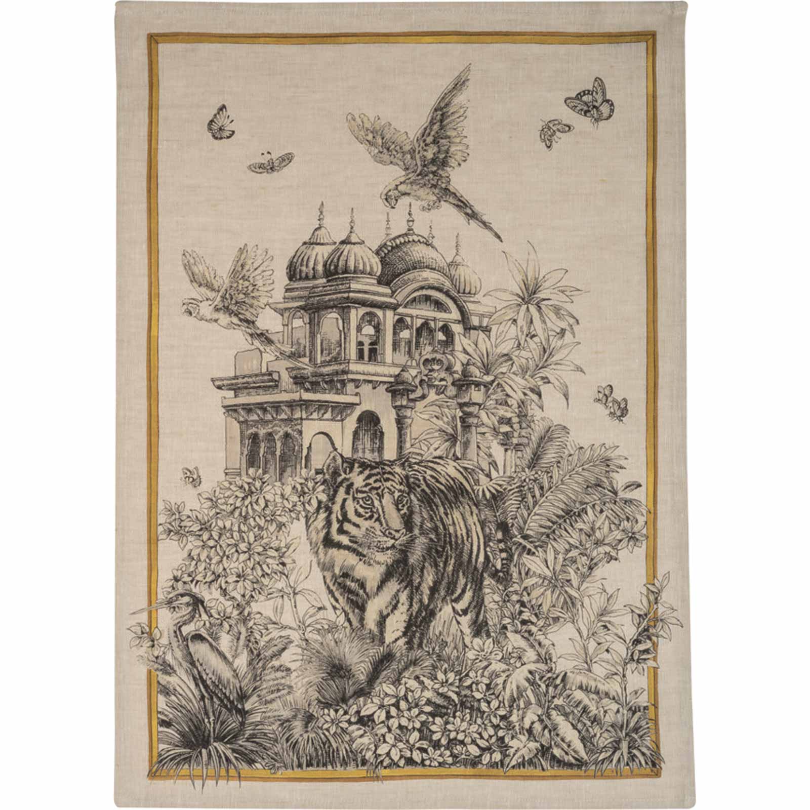 Maharani, Elefanten, Tiger, exotische Pflanzen und zauberhafte Paläste. Das gehört natürlich zu Indien. Auf dem 2022 entworfenem Dessin TANTRA ist dieses zu sehen. Das exotische Muster ist in dezenten grau gehalten. Die Tischwäsche hat zusätzlich einen schmalen currygelben Rand.