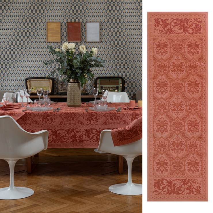 Die quadratische Tischdecke mit dem verschlungenen Motiv TOPKAPI in der Farbe terra hat eine Größe von 170 x 170 cm. Sie ist aus reinem Baumwollsatin und bei 60° C waschbar. Erheben sie ihren Tisch zur Tafel mit diesem edlen Muster!