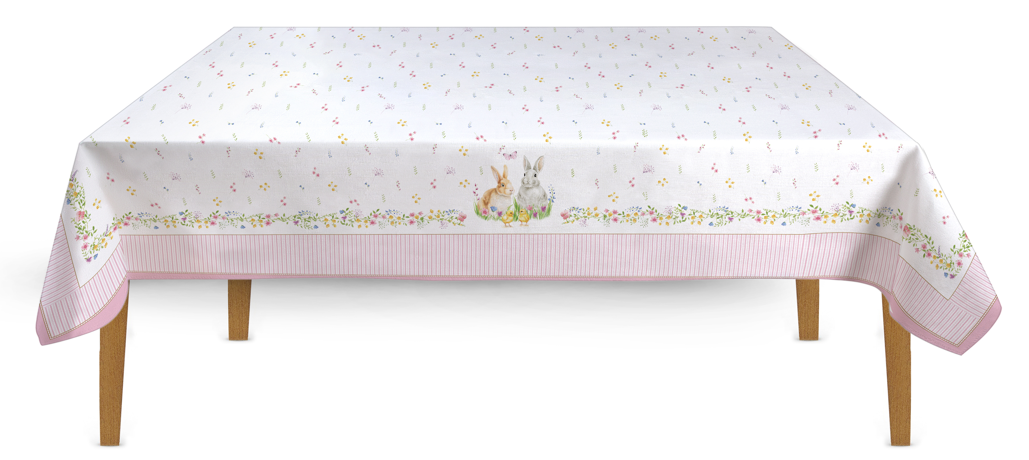 Die Tischdecke hat eine Größe 145 x 250 cm. Sie ist aus reiner Baumwolle, hat umlaufend ein rosa Streifenmuster, einen Blütenrand, allover kleine Blüten und das Hasenpaar an der Längsseite.