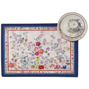Fühling und Sommer auf einer Tischdecke vereint. Das schaft das Motiv PRIMULA mit mehrfarbig gestreiftem Rand. Verschiedenste Büten in multicolor zieren Sets, Tischwäsche Geschirrtücher und Plaids.