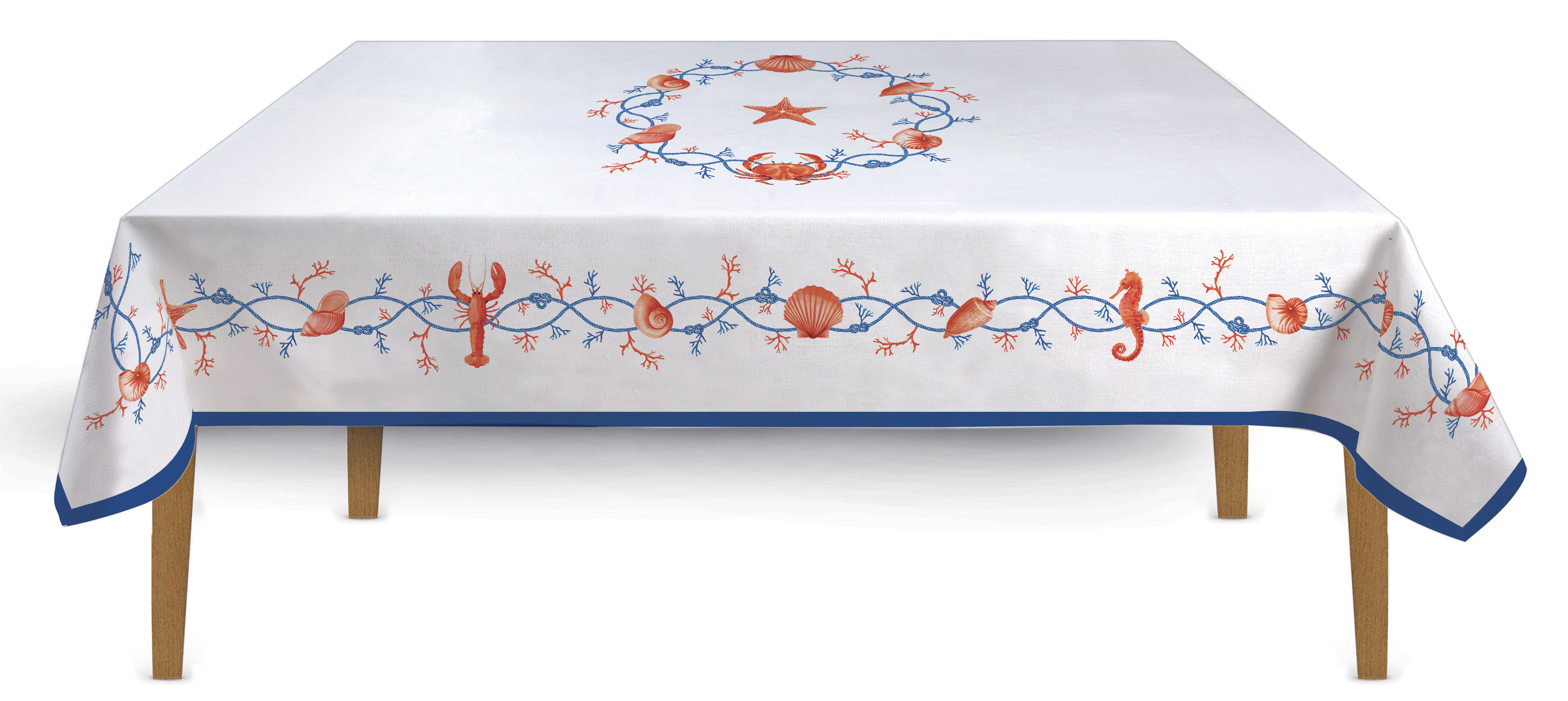 Das Mittelmeer war die Idee zu dem Dessin COTE DE MER. Blaue verschlungene Kordel, rote Korallen, Muscheln, Seestern und Meeresfrüchte sind auf dem Geschirr und auf der passenden Tischwäsche zu sehen. Alle Teile haben einen schmalen blauen Rand.
