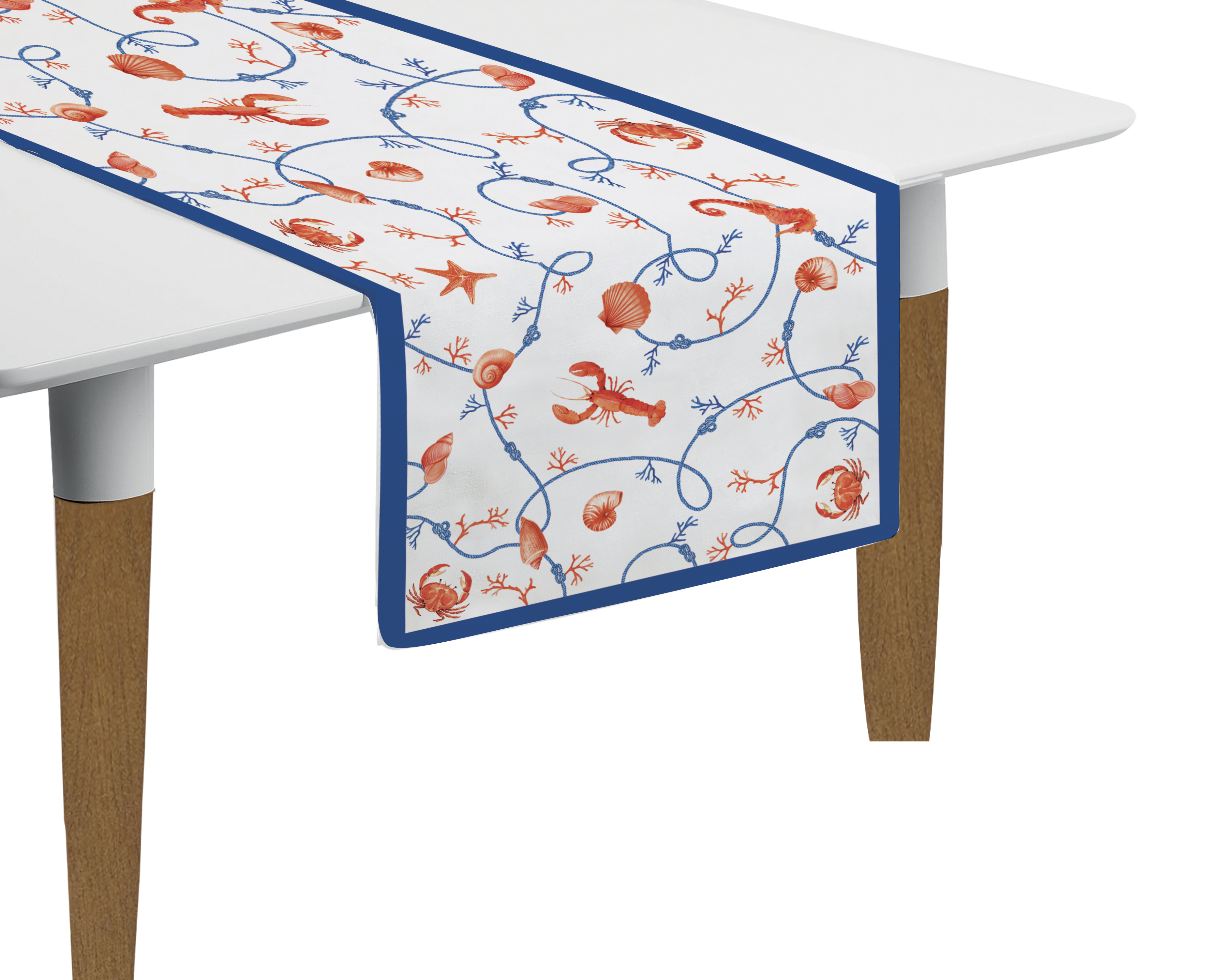 Das Mittelmeer war die Idee zu dem Dessin COTE DE MER. Blaue verschlungene Kordel, rote Korallen, Muscheln, Seestern und Meeresfrüchte sind auf dem Geschirr und auf der passenden Tischwäsche zu sehen. Alle Teile haben einen schmalen blauen Rand.