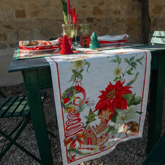 Die quadratische Tischdecke MARZAPEPE aus der Weihnachtskollektion 2025 hat diverse weihnachtliche Motive, wie z.B. Lebkuchenhaus, Weihnachtsstern und Süssigkeiten in multicolor als Motiv. Die Decke hat eine Größe von 170 x 170 cm und ist aus reinem Leinen. Ein Hingucker in der Advents - und Weihnachtszeit. Zeitlos schön!
